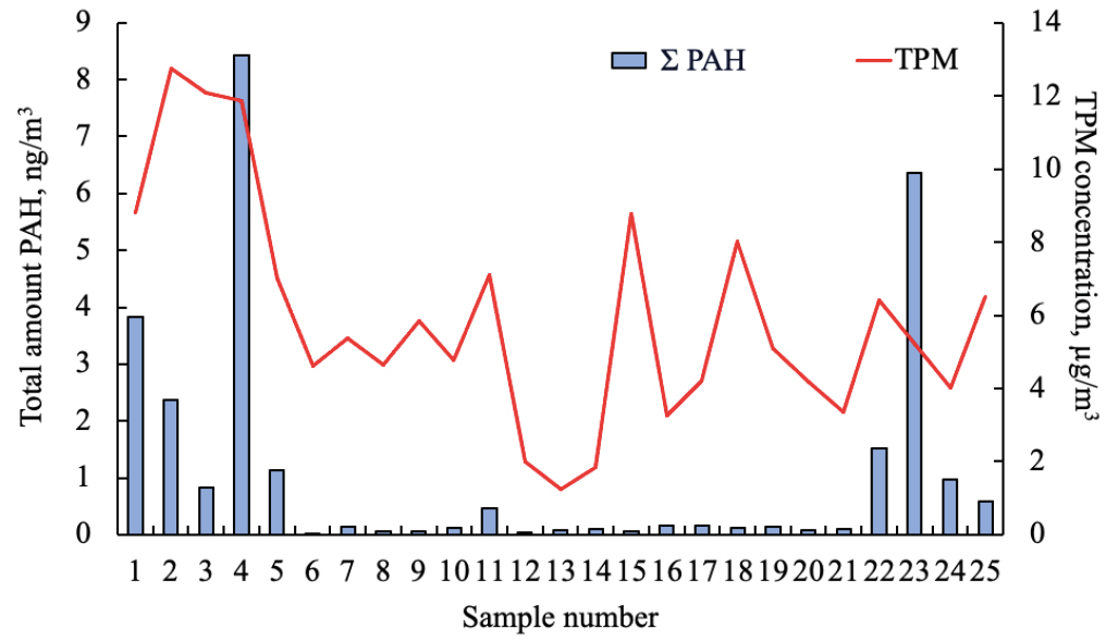 Рис.2. Массовая концентрация частиц ТРМ (мкг/м3), усредненная для каждой пробы, и сумма 21 ПАУ (нг/м3) в атмосфере над акваторией оз. Байкал (5-15 августа 2023 г.)