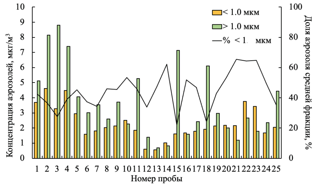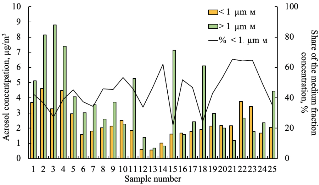 В динамике счетной концентрации аэрозольных частиц изменения отмечены как в средней фракции аэрозоля с размером до 1.0 мкм, так и в грубодисперсной фракции до 10 мкм. Во время экспедиционных работ отмечалось несколько эпизодов роста концентрации частиц средней фракции (PM1 < 1мкм). По маршруту в фоновом районе вдоль восточного берега (середина маршрута от б. Ая – остров Лохматый), количество средней фракции (PM1 < 1мкм) составляло 62% (Рис. 3, проба 14). В устье Харауза и при переходе от восточного берега к западному (устье Харауза-Большое Голоустное) за счет, действующего над оз. Байкал в этот период циклона, содержание средней фракции достигало 65% (пробы 21-23). В Южном Байкале с приближением к локальным источникам количество средней фракции аэрозоля резко снижалось с 43% до 27% (пробы 2-3), в Среднем Байкале у п. Усть-Баргузин – до 24% (Рис. 3, проба 15).