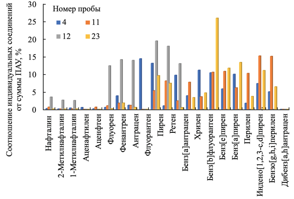 Отмечены различия в составе индивидуальных ПАУ, отобранных из различных районов над поверхностью озера (Рис. 4). Из 21 обнаруженных ПАУ доля основных соединений уменьшалась в последовательности: пирен (11.8%) > бенз(k)флуорантен (11.7%) > индено(1,2,3-с,d)пирен (8,3%) > бенз(e)пирен (7%), бенз(a)пирен (7%). В пробах аэрозолей вблизи локальных источников южной части Байкала (№ 4, 11, 23) преобладала группа ПАУ с четырьмя-пятью- шестью бензольными кольцами их доля – до 84% от общей массы. Это указывает на пирогенный характер источников при сжигании угля, древесины, жидкого топлива (Othman et al., 2022). В пробе 12 на маршруте г. Северобайкальск – бухта Ая количество ретена (компонента горения биомассы) достигало 18 % от общей массы обнаруженных соединений.