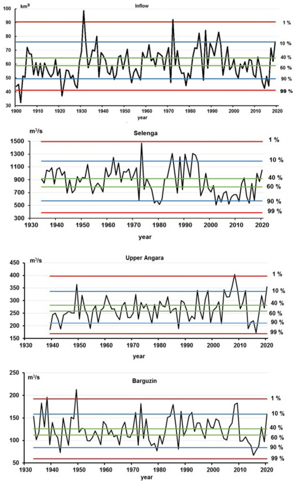 The results of calculations indicate that the annual water inflow to the lake was catastrophically high approximately half a century ago (1973), reaching 92.2 km3 (Fig. 1). The maximum inflow observed was 98.7 km3 and was recorded in 1932. Additionally, a markedly low inflow was observed in Lake Baikal for an extended period, in 1903 and 1922. The occurrence of these events was not within the calculated period, and thus, their probability of occurrence was low. In particular, the observed decrease in inflow in 1903 to 32.2 km3 corresponds to the provision of more than 99.9%, or a recurrence less than once in 1,000 years. Since the beginning of the 21st century, the lowest water years were 2014-2017, with a minimum inflow of 42.5 km3 in 2015.