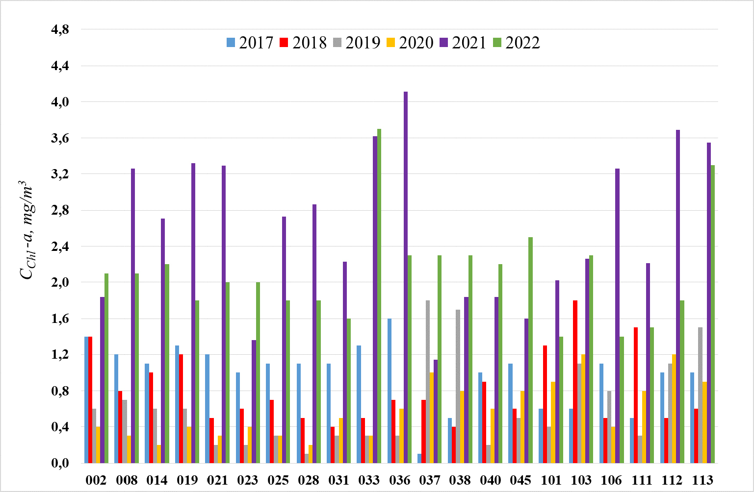 In the course of our 6-year study, the content of Chl-а the main photosynthetic pigment of phytoplankton algae, varied as 0.1–4.1 mg/m3 (average: 2.1 mg/m3), thereby corresponding to the oligotrophic type of lakes (Fig. 4). Its maximum was recorded in 2021 in all sampling sites of the lake (1.1–4.1 mg/m3), while its minimum – in 2019 (0.1–1.8 mg/m3).). In general, the lake is characterized by poor development of algae phytoplankton because of low concentrations of nutrients and instability of the water column most of the year. In Lake Teletskoye waters, the specialists of the Chemical Analytical Center of IWEP SB RAS headed by Dr. Sc. Papina detected a low content (0.7–1.9 mg/dm3 that is typical for oligotrophic lakes) of biogenic elements of the nitrogen group dominated by nitrate ions as a mineral nitrogen form. The concentrations of phosphate ions in the lake were insignificant (within micrograms), while silicon was one or two orders of magnitude higher than the content of other biogenic elements and averaged 2.2–2.9 mg/dm3.
