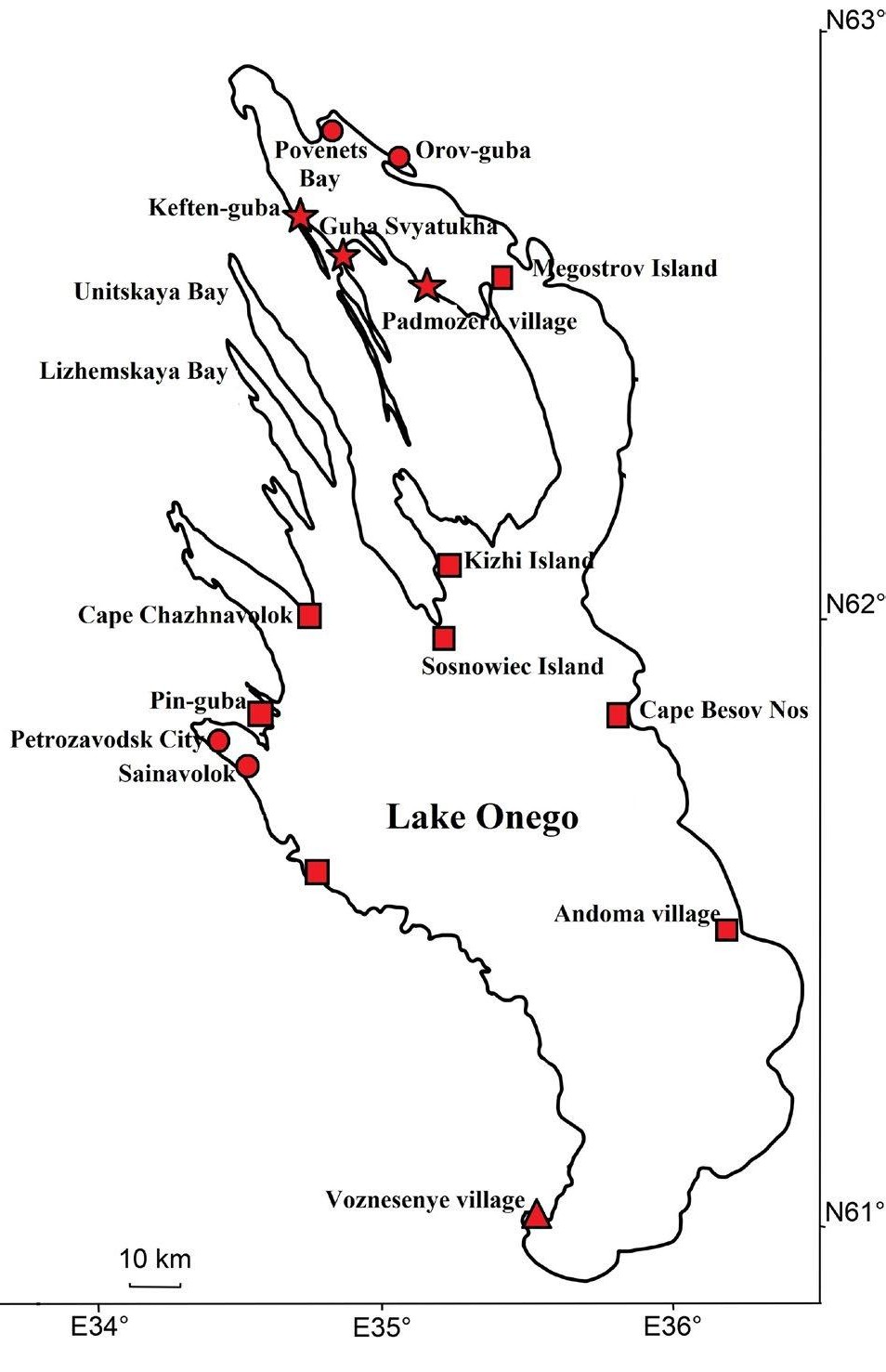 Fig.3. Map of identification of the amphipod G. fasciatus in Lake Onego. Star – data from 2023. Triangle – data from 2012 (Sidorova, in press). Square – data from 2014 (Sidorova and Belicheva, 2017). Circle – data from 2022 (Sidorova, in press).