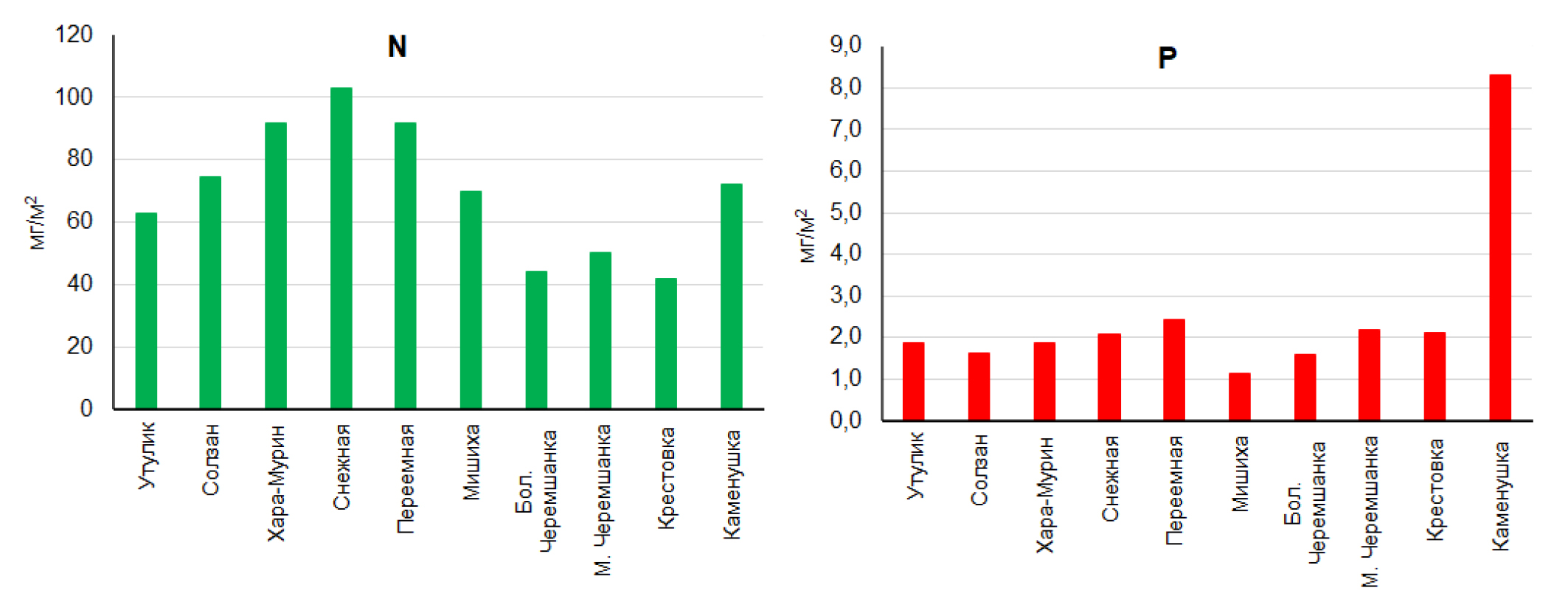 The content of Ntot in the water of tributaries varied from 0.12 to 0.51 mg/L. The highest concentrations were recorded in the Utulik and Solzan rivers, with mean annual values of 0.45 and 0.39 mg/L, respectively. The lowest recorded concentration, with mean annual values of 0.21 and 0.24 mg/L, was observed in the Pereemnaya and rivers (Fig. 3).