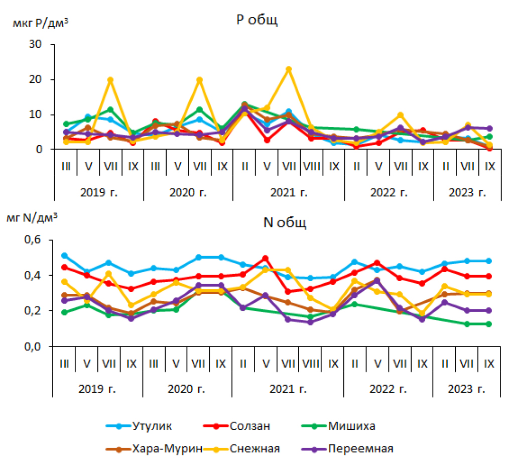 Fig.3. Seasonal and interannual dynamics of the content of total phosphorus and total nitrogen in the water of tributaries of the south-eastern coast of Lake Baikal, 2019–2023.
