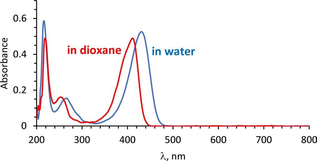Fig.2. Absorbance spectra of 10 µM QA2 solutions in water and 1,4-dioxane.