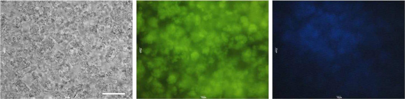 Light and fluorescent microscopy was performed with MOTIC AE-31T inverted microscope with a HBO 103 W/2 OSRAM mercury lamp. Excitation was performed at 470 nm for green and yellow emission and 365 nm for blue emission.