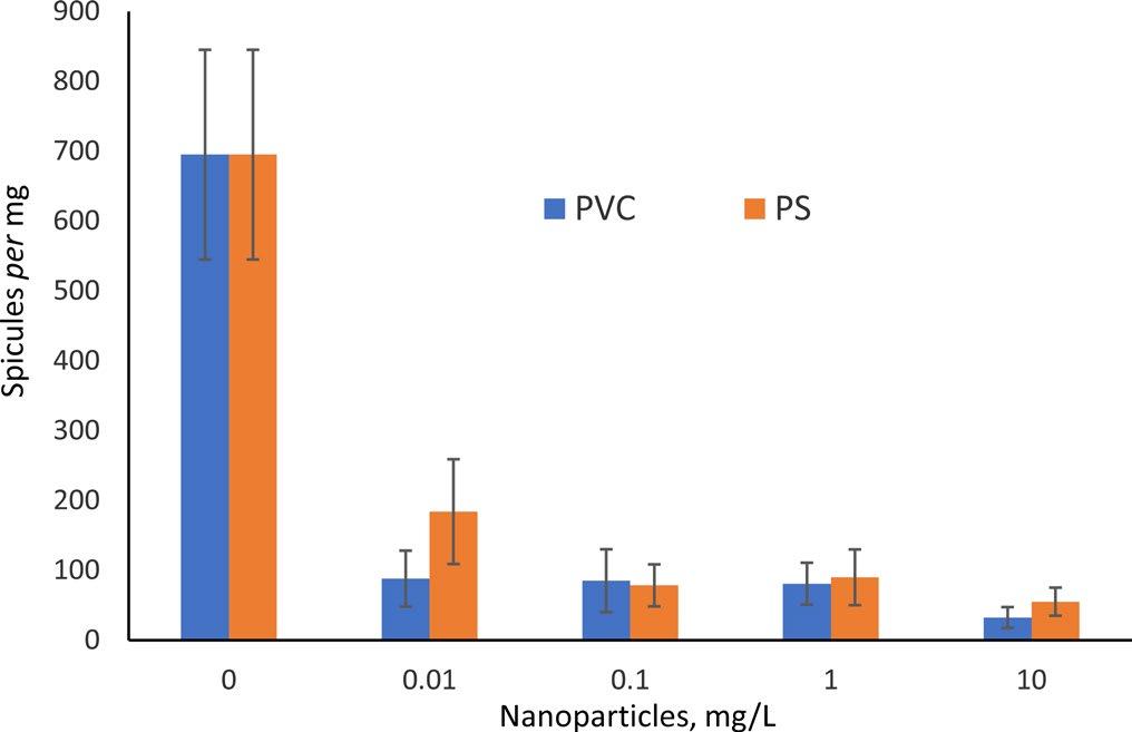 Fig.2. Dependence of the number of spicules per dry weight of primmorph (mg) on nanoplastic concentration. NBD-N2 dye (0.5 μM) was added to the culture medium as a vital dye for new spicules. PVC particle size was 65 nm and PS – 200 nm. The cultivation time was one month.