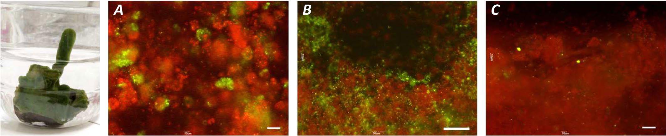 Рис.1. Губка L. baicalensis в аквариуме и флуоресцентные изображения срезов губки после 8 дней культивирования в присутствии нанопластиков. Красная флуоресценция - хлоропласты, зеленая - наночастицы пластика. A – частицы ПС 200 нм, B и C – частицы ПВХ 85 нм. Частицы окрашивали дибензилфлуоресцеином. Концентрация пластика составляла 1 (А и В) и 0,1 (С) мг/л. Масштабные линейки составляют 25 (A), 50 (B) и 75 (C) µм.