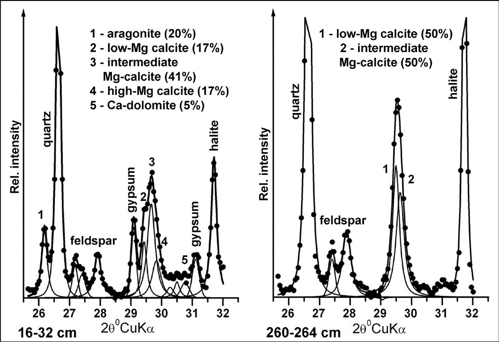 The samples were studied by X-ray diffractometry (XRD), IR spectroscopy, laser particle size analysis, X-ray fluorescence spectrometry and radiocarbon dating (AMS). The differential diagnostics of carbonate minerals in the lake sediments was made by mathematical modeling of high-resolution XRD profiles (Solotchina and Solotchin, 2014). Decomposition of diffraction profiles of Mg-calcites into individual peaks using the Pearson VII function revealed the positions, integrated intensities, and quantitative relations of the peaks (Fig.). The MgCO3 content was determined from the calibration curves (Deelman, 2011).