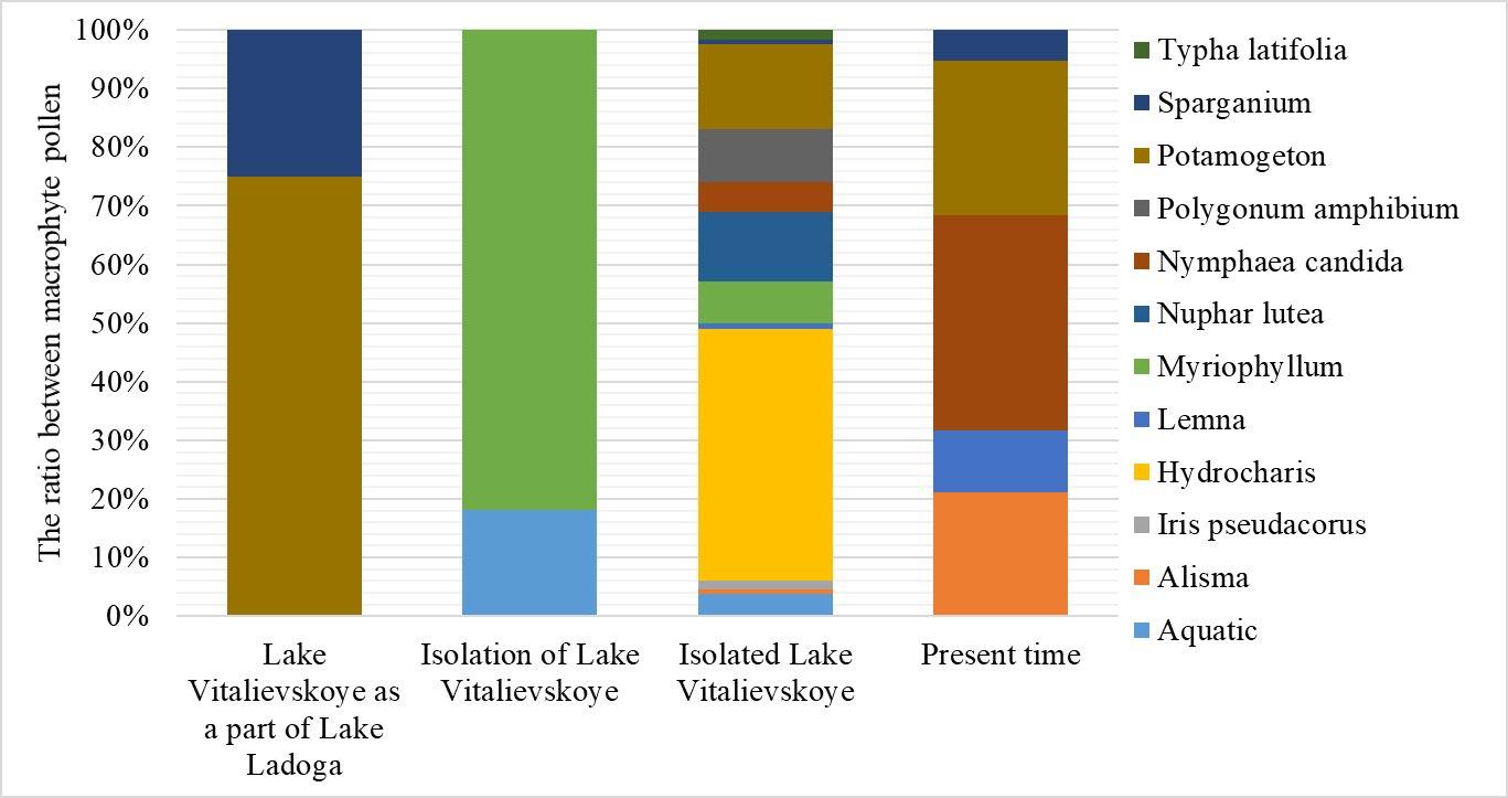 The macrophyte dynamics at every stage of the Lake Vitalievskoye development was reconstructed. The obtained data helped us to reconstruct the Late Holocene history of the lake and describe its isolation process from Lake Ladoga.