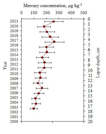 Subsequently, the mercury concentration, in general, decreased monotonously from 199.3 µg·kg-1 in the 5-6 cm layer (2015-2016) to 164.0 µg·kg-1 in the 13-14 cm layer (2007-2008) and down to the minimum value of 99.0 µg·kg-1 at a depth of 17-18 cm (2002-2003) (Fig. 1).