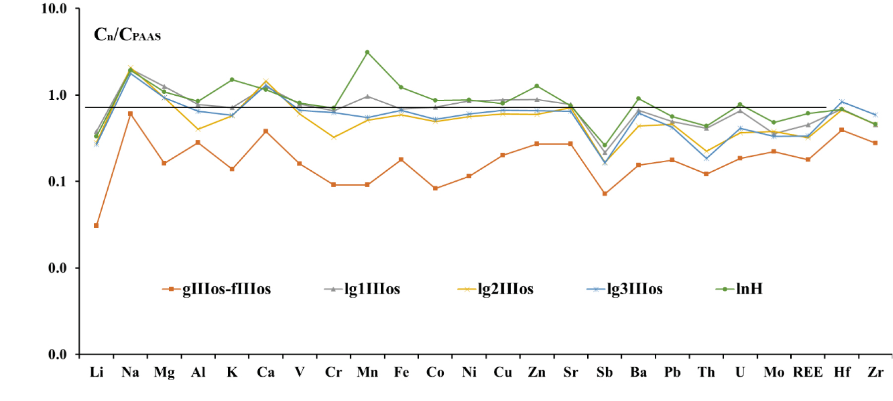 Fig. Distribution of element contents in bottom sediments normalized to PAAS (Post-Archaean AustralianShale) (Taylor and McLennan, 1985).