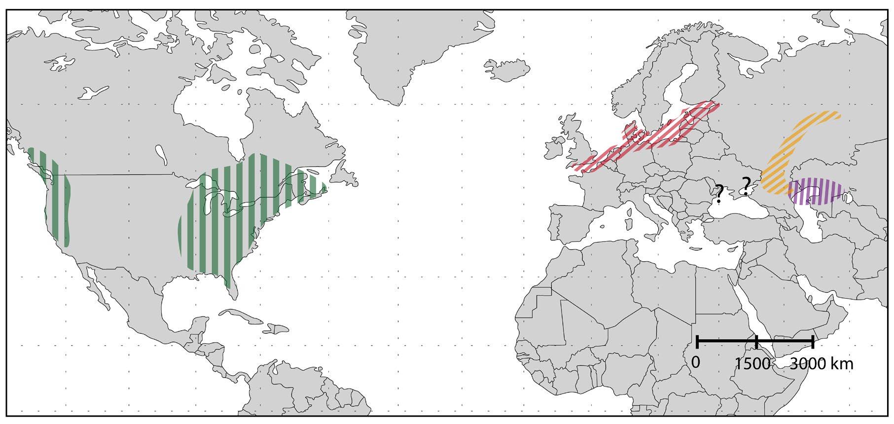 Fig.3. Confirmed native area (in green) of Acanthocyclops americanus (Marsh, 1893) and the extent of its invasion in the Palearctic (in red).