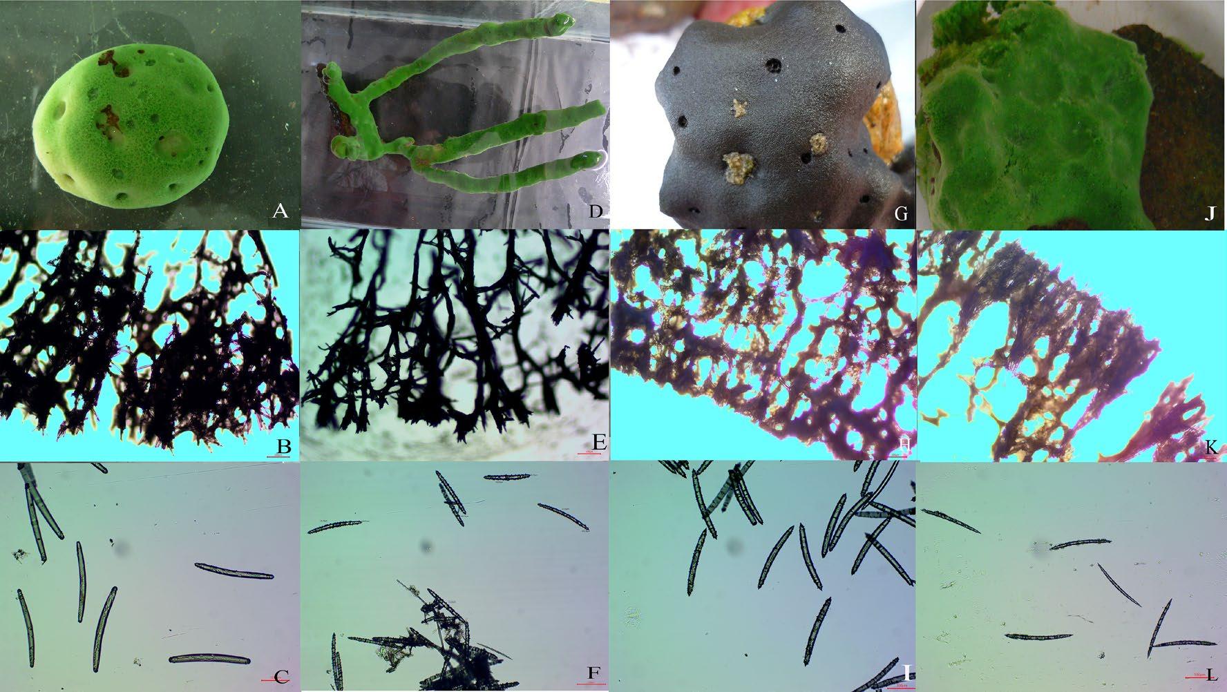Fig.1. Sponge body, the skeleton and microscopy of megascleres, respectively, of (A–C) Baikalospongia bacillifera; (D–F) Lubomirskia baikalensis; (G–I) B. intermedia; and (J–L) L. abietina.
