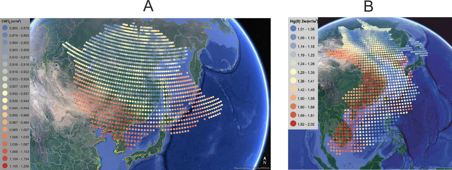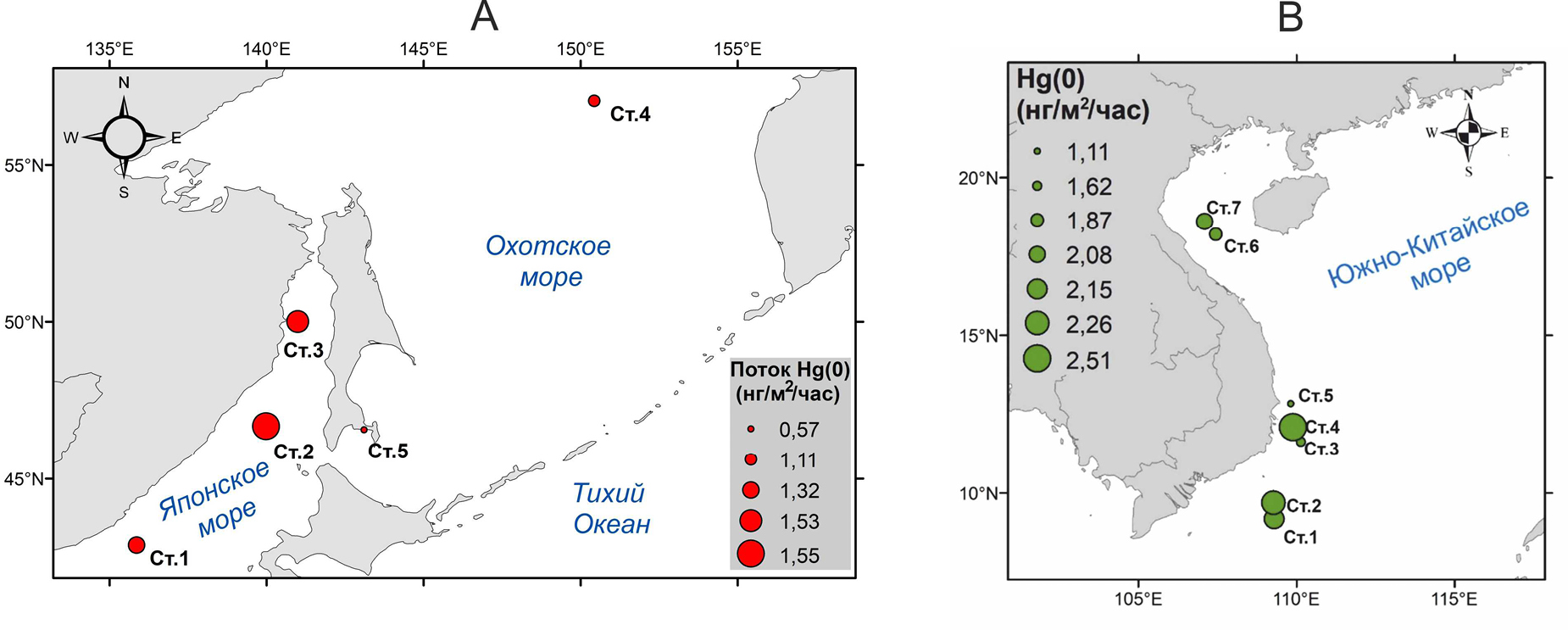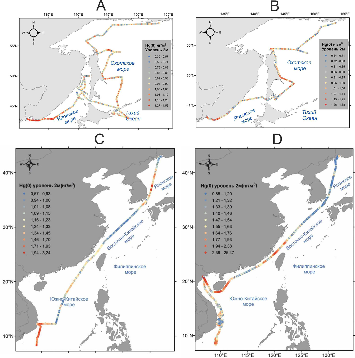 To identify the source regions that affect the concentrations of Hg(0) in the atmosphere over the marginal seas of the northwestern Pacific Ocean, we conducted a study covering the water area from the South China Sea to the Sea of Okhotsk during two adjacent cruises on board the R/V Akademik M.A. Lavrentev.