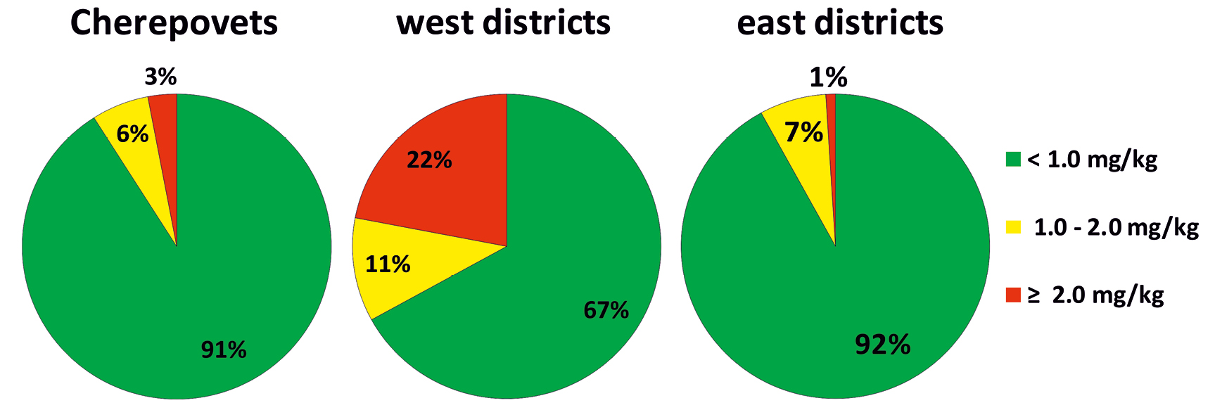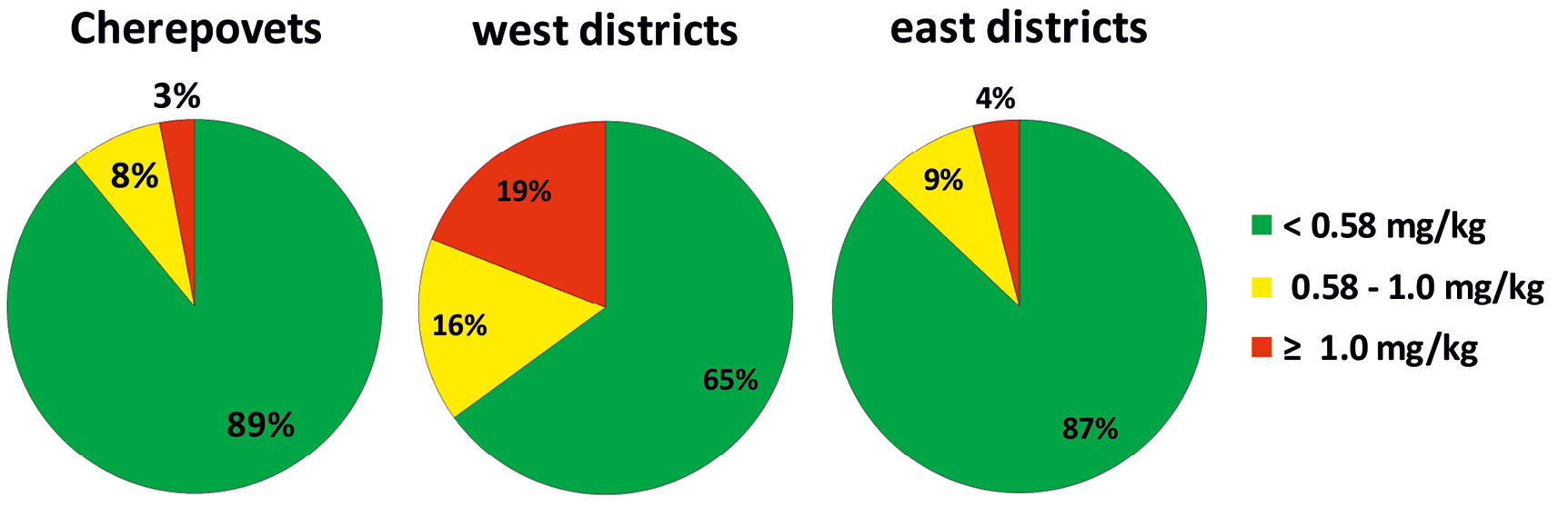 Mercury concentrations in the hair of women living in the eastern part of the region and in Cherepovets were also less than 0.58 mg/kg (the threshold, at which there is a risk of disruption of the nervous system in the fetus), i.e. in 87% and 89% of cases, respectively. At the same time, the concentrations exceeding 1 mg /kg (the threshold, above which mental retardation may occur in children in the future) were detected in 13 and 11% of women from these areas. At the same time, 35% of women living in the western districts of the Vologda Oblast were at risk (Fig. 2).