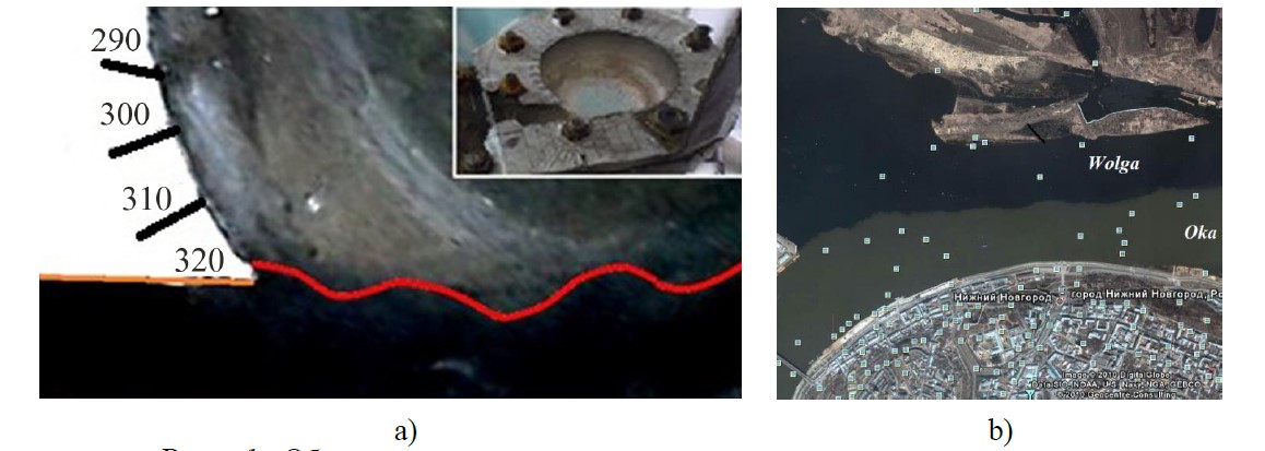 2. Fig. 1. Formation of elastic waves from the merger at an angle of two flows: a) in a vortex chamber (on a special stand with the introduction of a coloring solution-visualizer); b) at the confluence of the giant streams of the Oka and Volga rivers