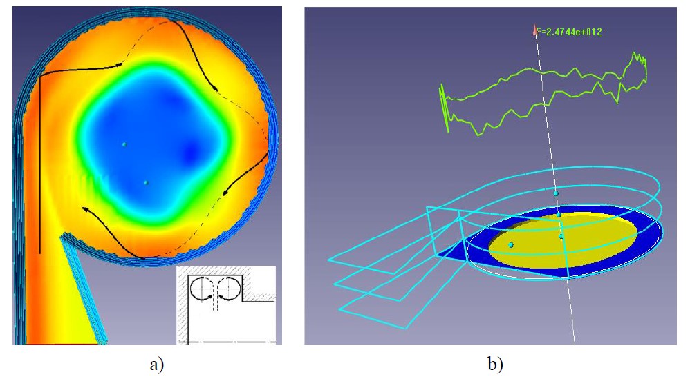 a) streamlines of the circumferential vortex flow; b) distribution of pressure along the shell of the housing due to the influence of torus vortices on it