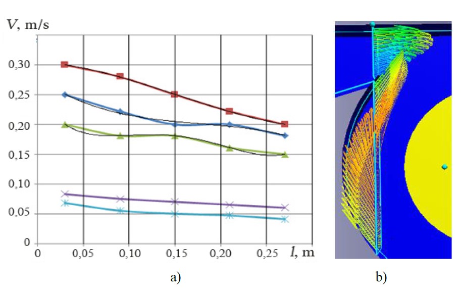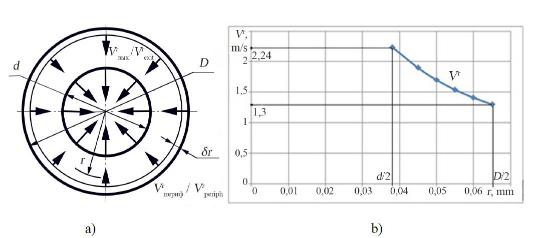 6. Fig. 5. The pattern of changes in the averaged radial component of the velocity of the working medium along the radius of the vortex chamber: a) diagram of the averaged radial flow from to ; b) the pattern of changes in the radial velocity of the averaged radial flow