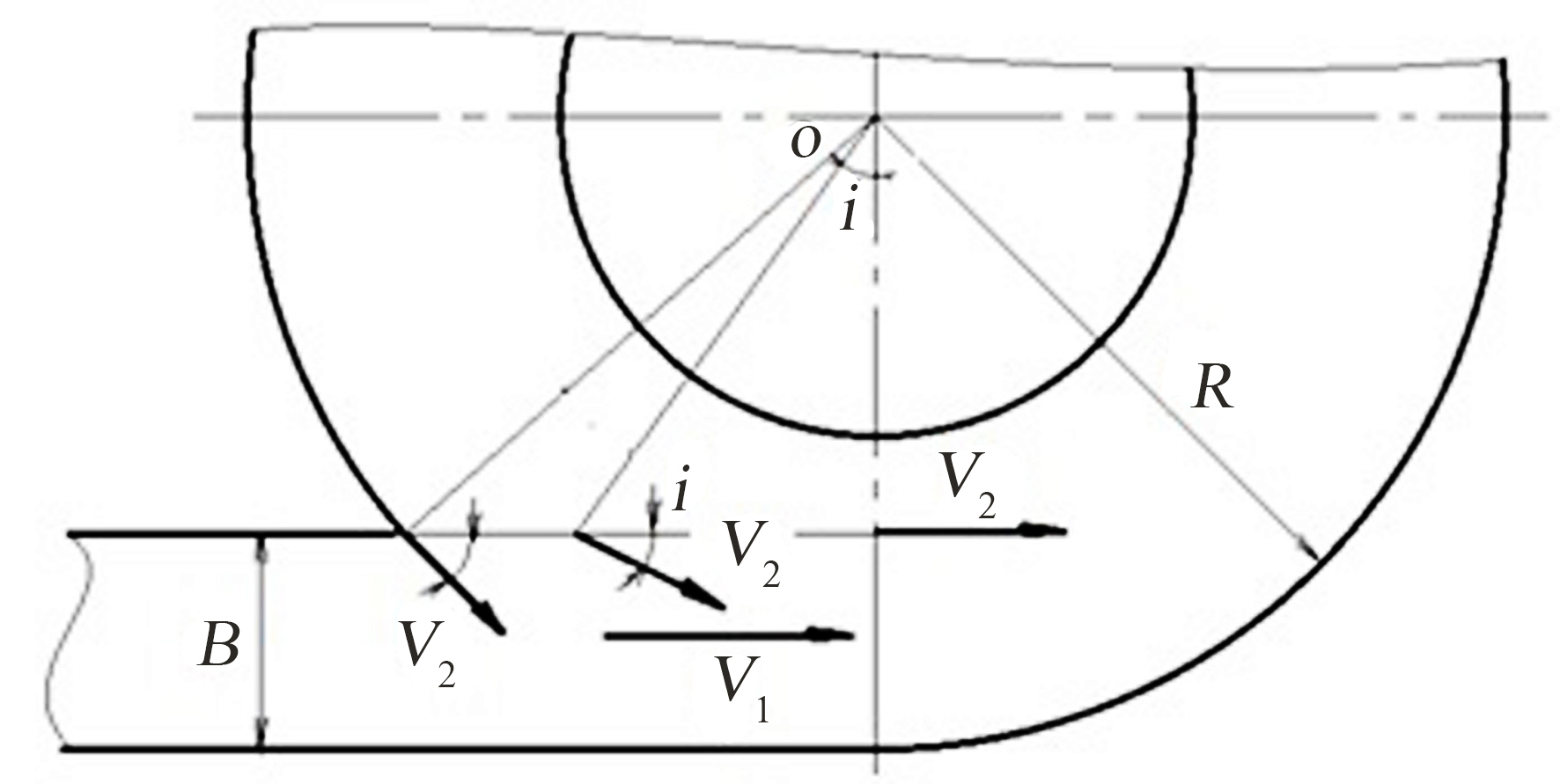 По мере дальнейшего движения в потоке за счет гидравлических сопротивлений от деформации при повороте, его скорость падает, что приводит к увеличению поперечного сечения, и на угловой величине α (рис. 2, 4) его внутренняя граница достигает точки входа в центральное осевое отверстие, после которой он стекает в центральное осевое отверстие по всей длине окружности.