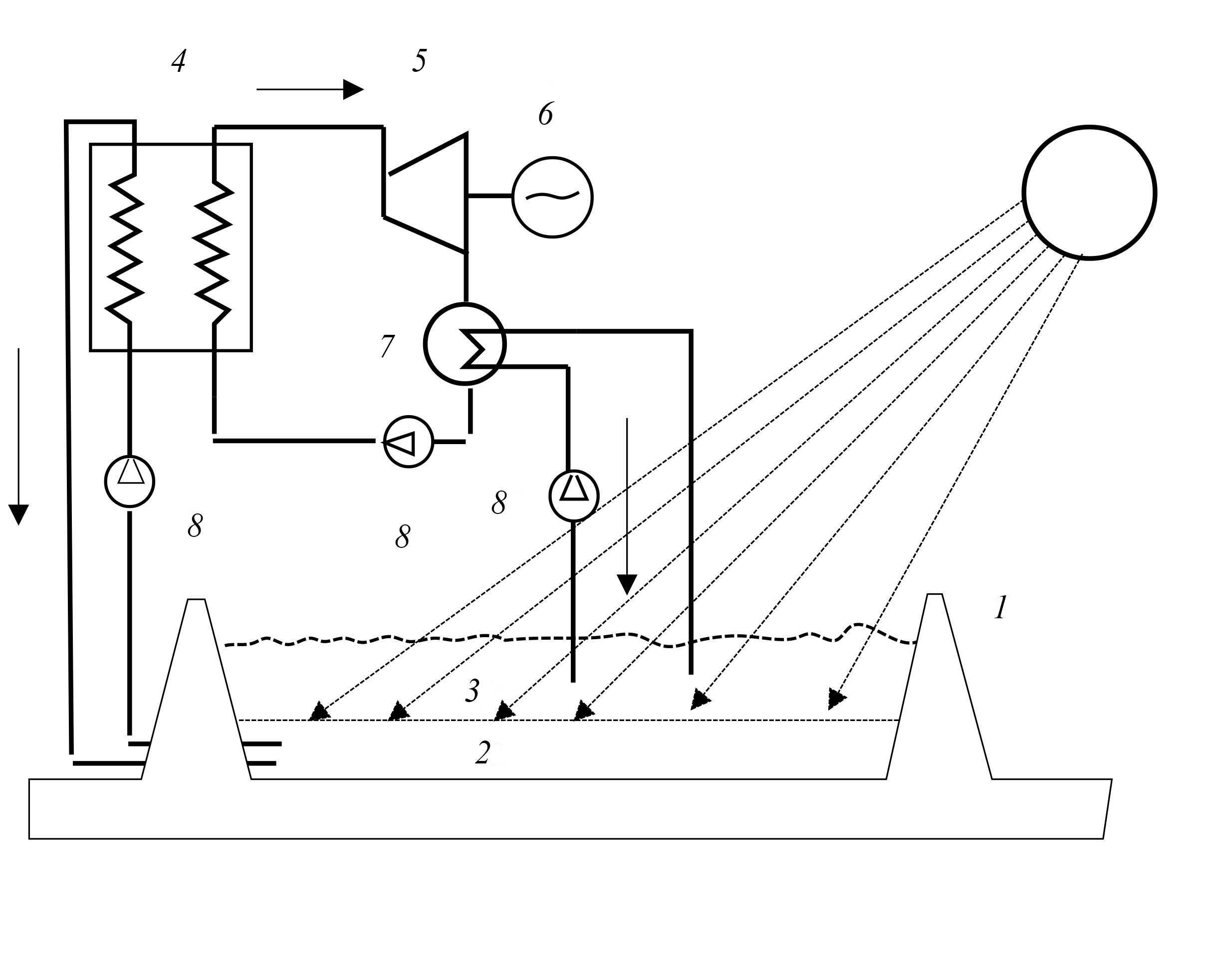 1 – dam; 2 – hot water with a high salt concentration; 3 – chilled water; 4 – heat exchanger; 5 – turbine; 6 – electric generator; 7 – capacitor; 8 – pumps
