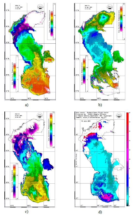 Рис. 2. Атлас температуры поверхности Каспийского моря и залива Кара-Богаз-Гол по данным ИК-изображения спутника NOAA-16 на: а) март; b) апрель; c) август; d) октябрь