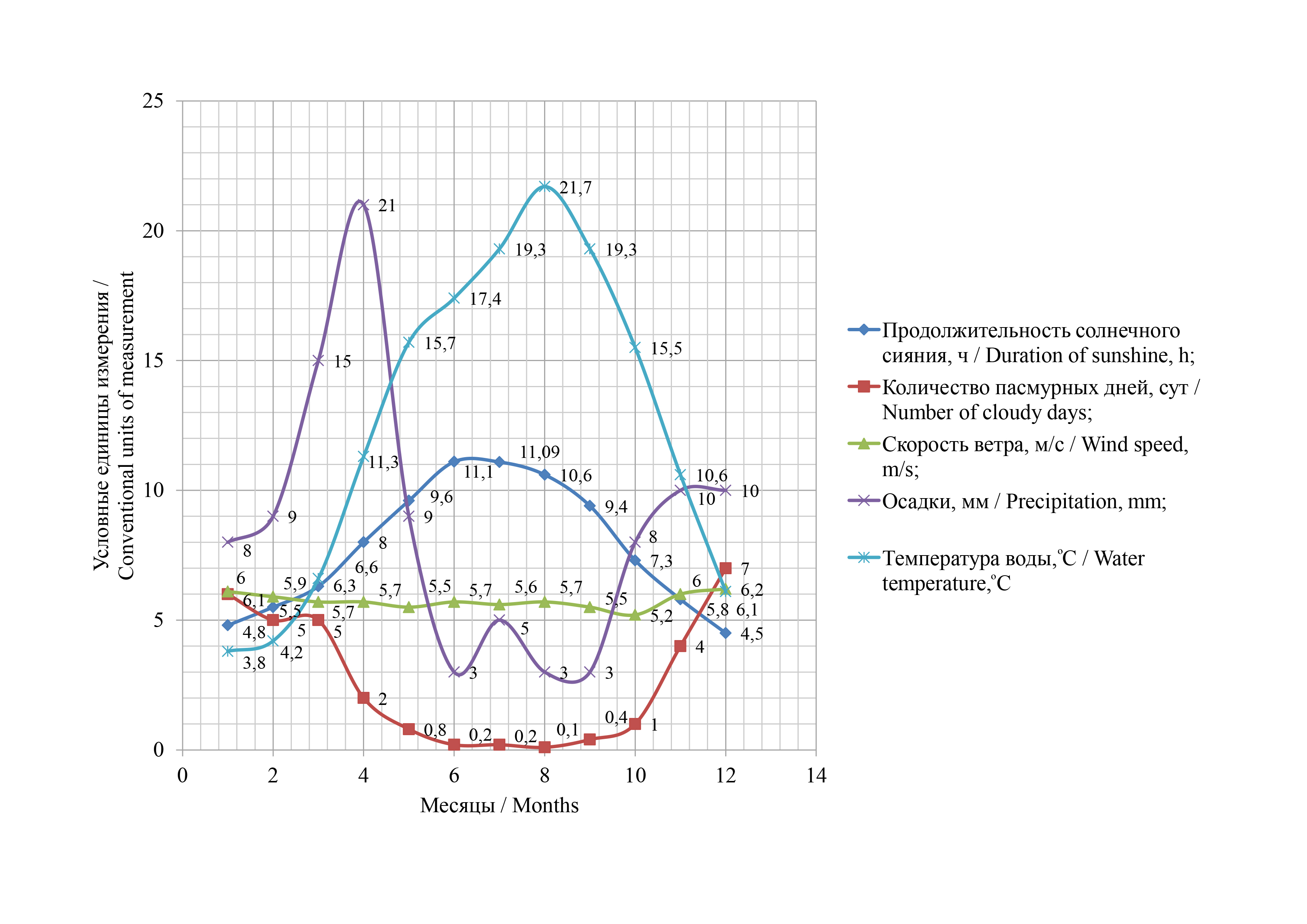 По результатам гидрометеорологического анализа построен график изменения температуры воды, скорости ветра, продолжительности солнечного сияния, количества пасмурных дней и осадков по месяцам года. Графическое изображение приведено на рисунке 3 10.
