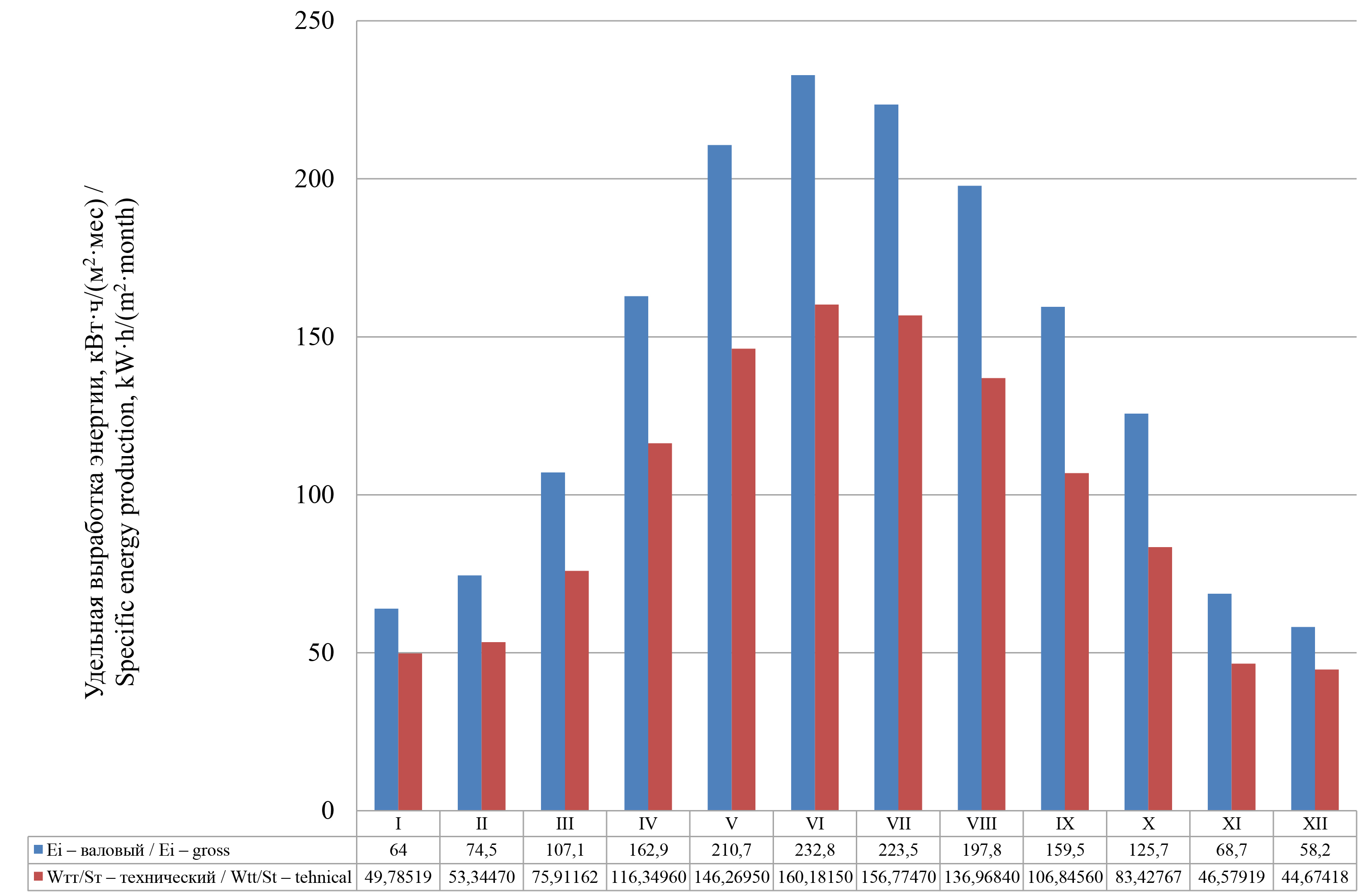 На рисунке 4 представлена гистограмма валового и технического потенциалов преобразования солнечного излучения в тепловую энергию по месяцам года.