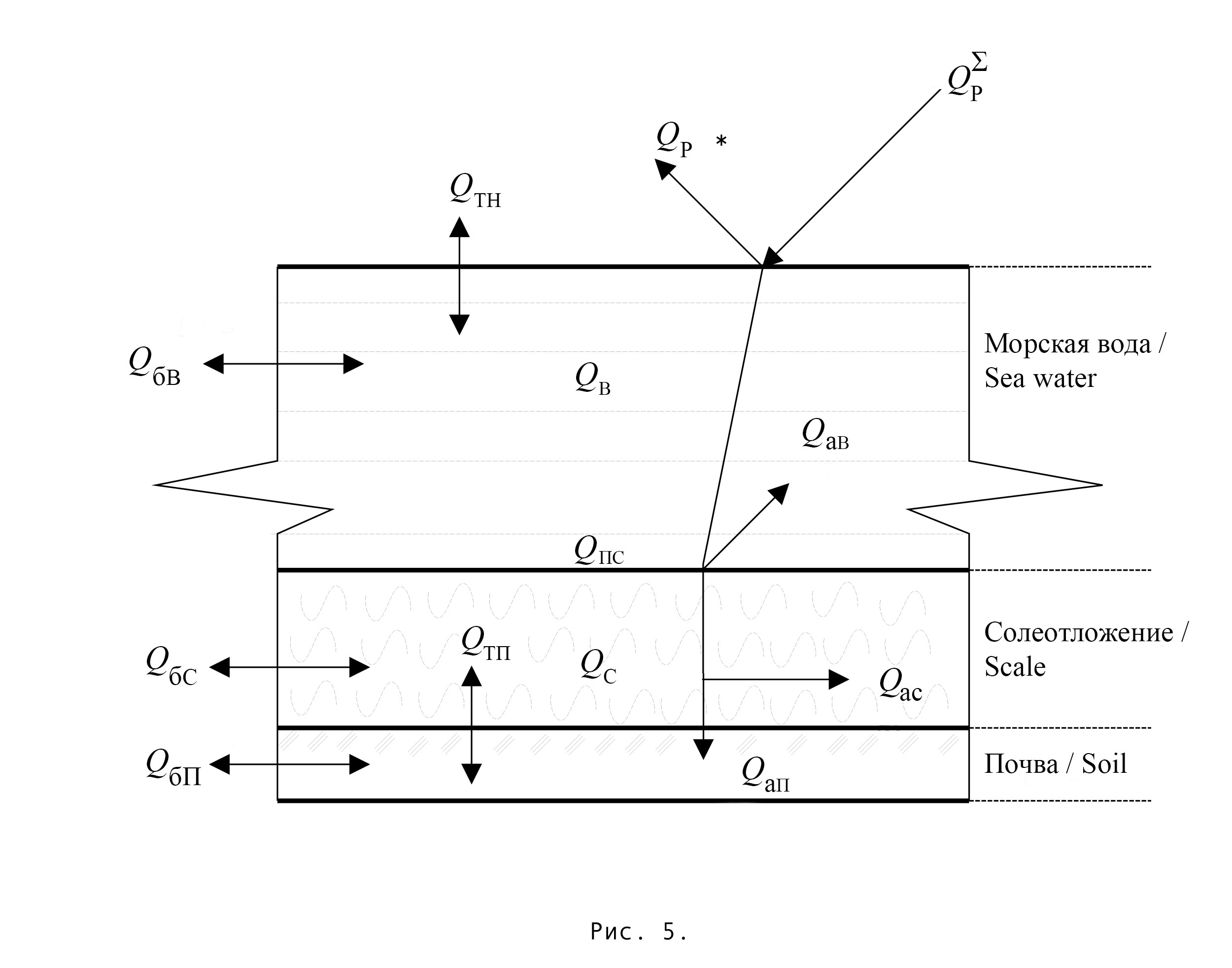 где – суммарный поток тепла солнечного излучения, поступающий в соленый водоем, кВт∙ч/м2; 12 dQав – поток солнечного излучения, который аккумулируется в водном объеме, кВт∙ч/м2; dQc – поток солнечного излучения, поглощенный солевой поверхностью дна пруда и почвой + dQп, кВт∙ч/м2; dQв – поток солнечного излучения, поступающий на водную поверхность водоема, кВт∙ч/м2; dQТН – количество тепла, отдаваемое в атмосферу с поверхности в результате воздухообмена и теплопередачи, кВт∙ч/м2; dQбг – количество тепла, отдаваемое в боковые грунтовые поверхности водоема в одномерном пространстве на 1 м2, объем не учитываем, dQбг ≈ 0 кВт∙ч/м2; dQаc – поток солнечного излучения, аккумулированный в солевом слое на дне, кВт∙ч/м2 [22].