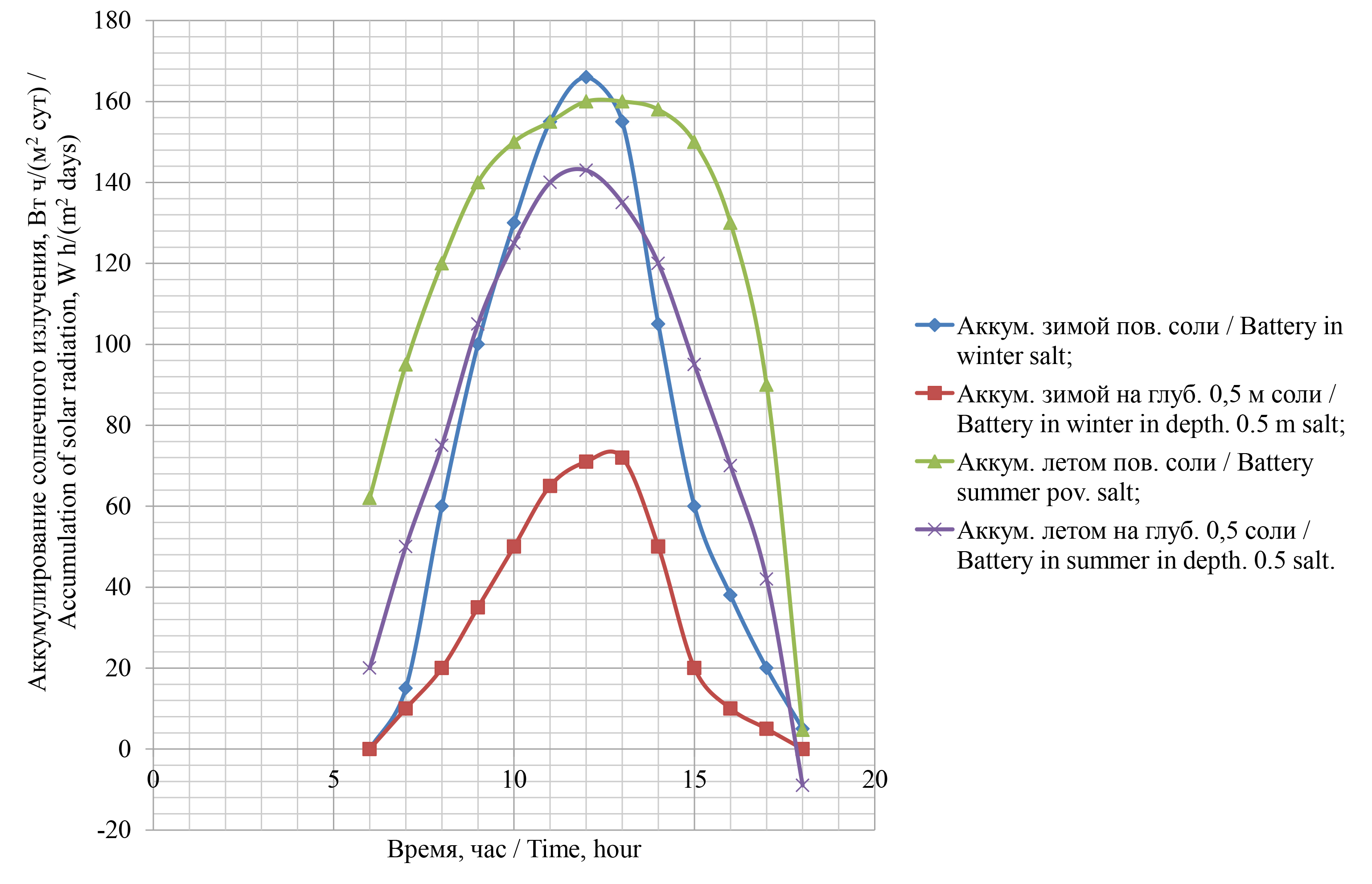 Температура на солевой поверхности зимой составляет от 3,8 до 31,5 ºС; летом – от 14,3 до 55,04 ºС. Температура на глубине 0,5 м солевой поверхности зимой изменяется в пределах от 3,8 до 15,76 ºС; летом – от 7,16 до 27,52 ºС. Процесс аккумулирования солнечной энергии связан с температурой прогрева солевой поверхности, которая меняется по сезонам года. Полученные научные исследования соответствуют законам теплофизики и адекватно воспроизводят результаты составленного дифференциального уравнения теплового баланса для промежутка времени.