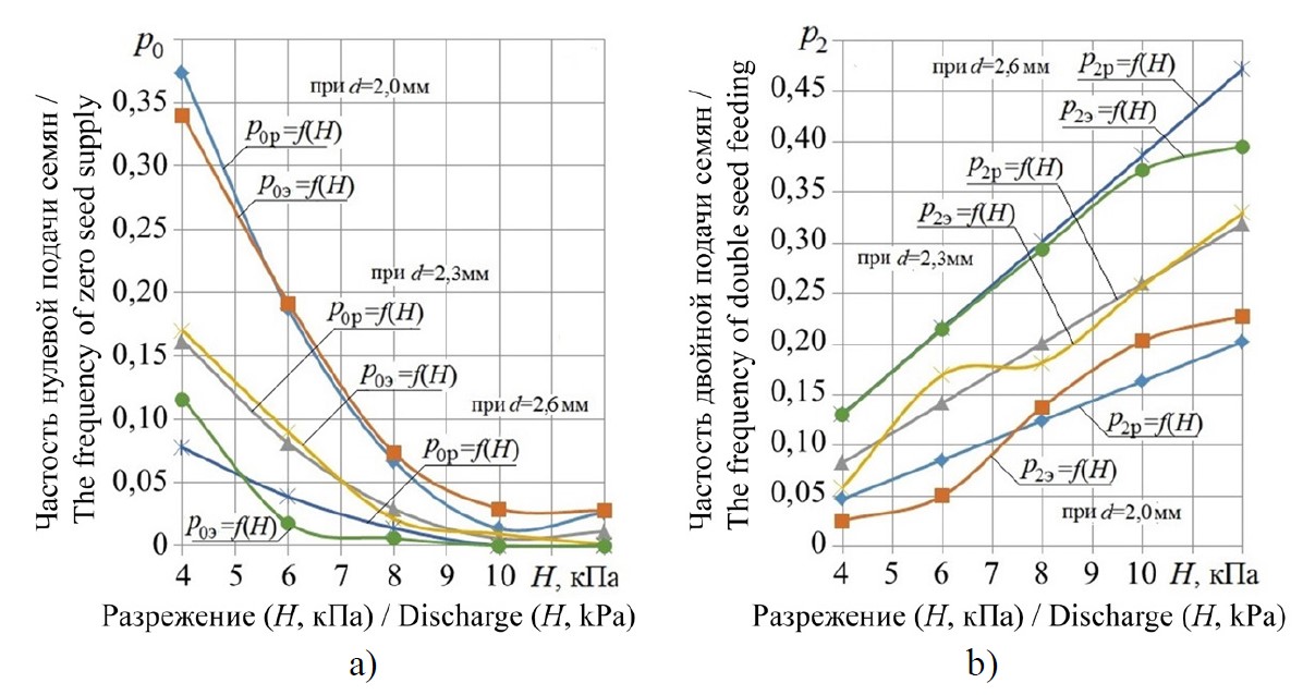 Проверка сходимости полученных результатов, проведенная с использованием критерия Пирсона, показала, что данные, сформированные расчетным путем, соответствуют экспериментальным с достоверностью 80–99 %. Совместный анализ экспериментальных и расчетных зависимостей позволяет предположить, что вероятность образования нулевых подач пропорциональна величине силы присасывания. Так, при высеве подсолнечника примерно одинаковая частость нулевых подач (около 0,05 %) обеспечивалась при примерном значении присасывающей силы 30 ± 2 мН, а при высеве кукурузы независимо от диаметра присасывающих отверстий – 52 ± 4 мН. В то же время вероятность образования двойных подач не определяется только значением силы присасывания, в опытах при уменьшении размеров присасывающих отверстий для образования групповых подач «требовалось» увеличение силы присасывания. Причем интенсивность изменения «необходимой» силы присасывания в обоих случаях составляет примерно около 10 мН/мм, что позволяет охарактеризовать изменение диаметра присасывающих отверстий как достаточно перспективный способ борьбы с двойными подачами семян. Полученные количественные оценки носят, несомненно, частный характер. Они характерны для семян конкретных сортов (гибридов) культур, использованных в эксперименте, и для семян с другими физико-механическими свойствами будут, скорее всего, другими.