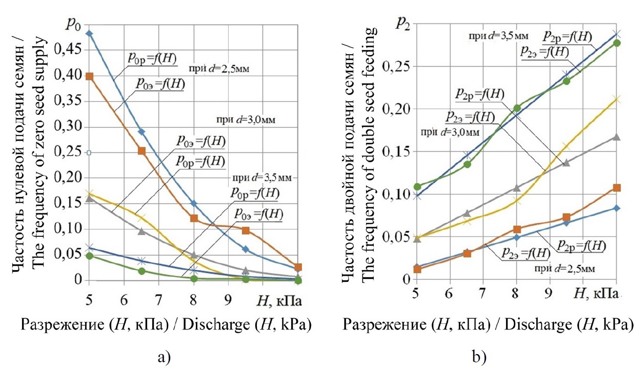 Discussion and Conclusion. The quantitative estimates obtained may differ for seeds of the same crop, but having different technological properties. The general factor is that the frequency of missing seeds is proportional to the suction force magnitude in the working plane of the metering element, regardless of its area. At the same time, the probability of double seed placing depends on the area of the metering ports with a constant suction force, a decrease in their diameter leads to a decrease in the frequency of double seed placing. The data obtained allow considering joint variations in the magnitude of the rarefaction in the vacuum chamber and the diameter of the suction holes as effective tools for improving the seed placing quality.