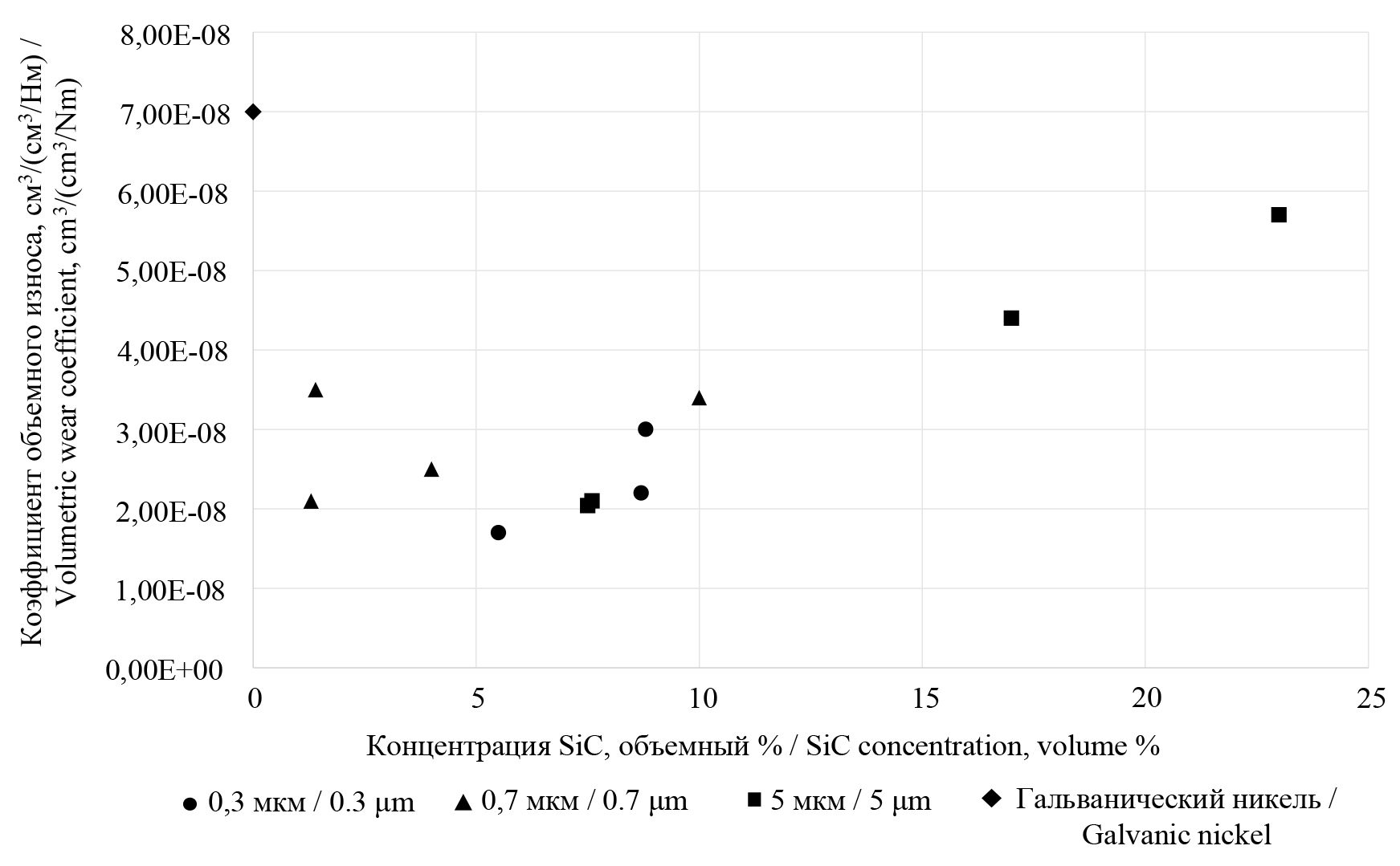 Объемный коэффициент износа сокращается в большинстве случаев с уменьшением размера частиц. Это означает, что низкий объемный процент субмикронных частиц SiC в композитных покрытиях Ni-SiC приводит к такой же стойкости к износу, как и покрытие, содержащее более высокий объемный процент микронных частиц.