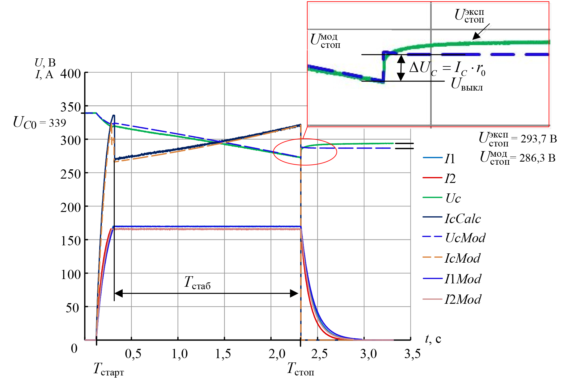 Необходимым условием сравнения результатов эксперимента с моделированием, помимо равенства зарядного напряжения накопителя, параметров секций и токов, является равенство потребленной энергии , , , где эксп – значения, полученные экспериментально; мод – значения, полученные в результате моделирования.