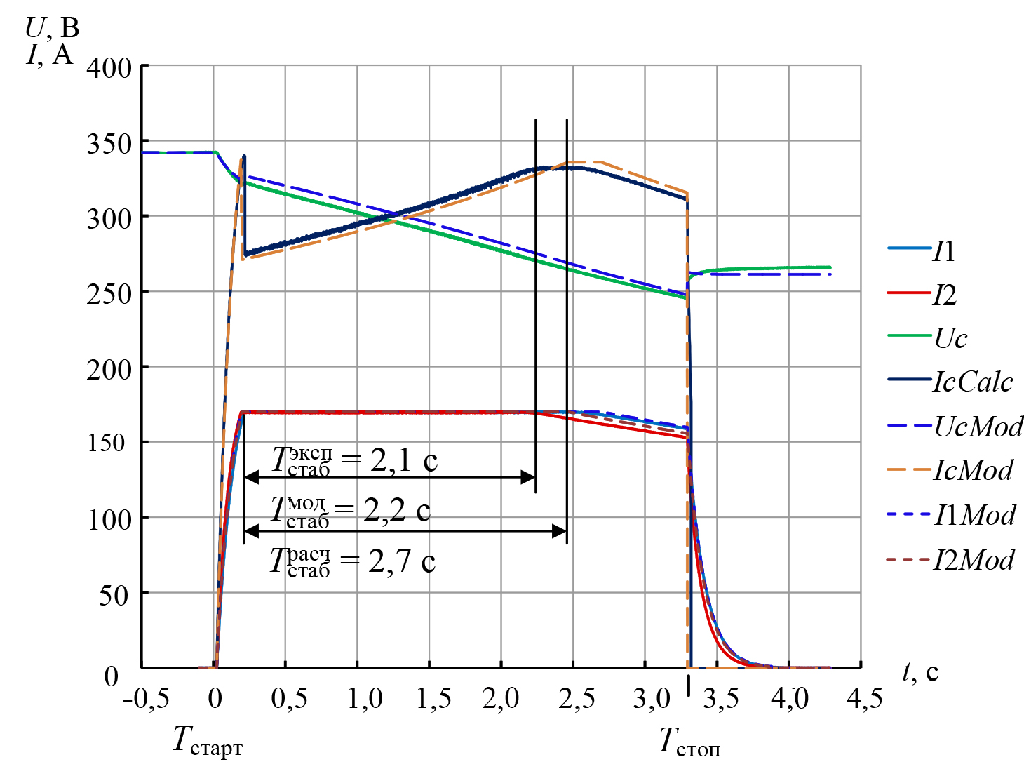 В ходе экспериментов также определялась максимальная длительность стабилизации тока, которая затем сравнивалась с результатом моделирования и аналитического расчета. Накопитель во всех случаях был заряжен до 342 В, для удобства аналитического расчета значения тока в обеих секциях были одинаковыми и составляли 170 А, начальная температура обмоток – 24 °С, средняя мощность, потребляемая от накопителя, во время стабилизации тока – 87,5 кВт.