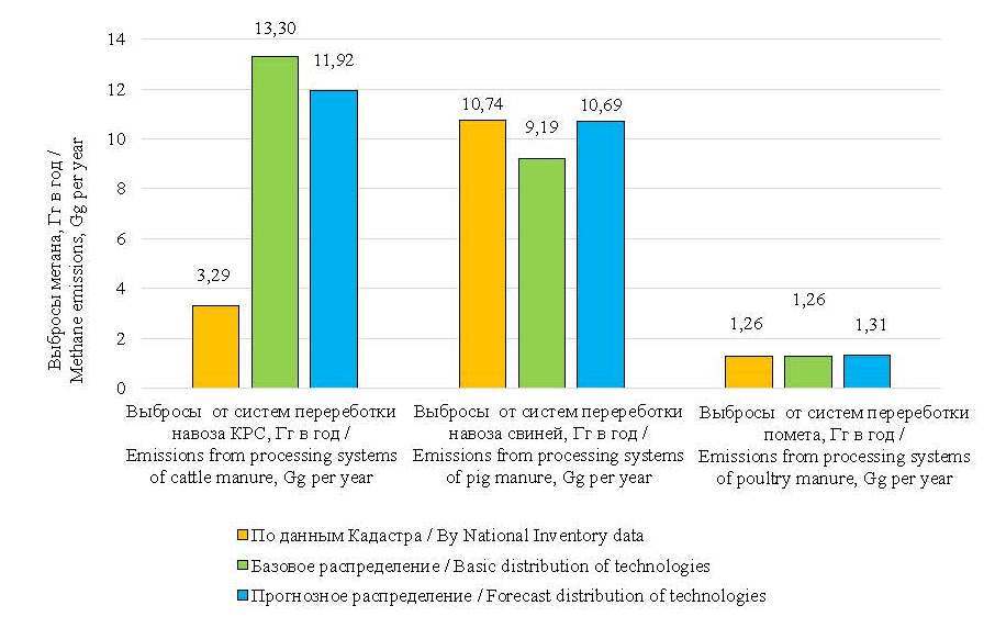Чтобы понять, как расчет эмиссии зависит от технологий переработки через применяемые коэффициенты MCF(S, k) и MS(T, S), произведен расчет годовых эмиссий метана и закиси азота для двух вариантов: 1) по данным Кадастра с учетом доли навоза, перерабатываемого каждой технологией, и фактической массы навоза, рассчитанной на основании статистических данных за 2022 г.; 2) по фактическим данным распределения технологий с последующим определением доли перерабатываемого навоза в соответствии с каждой технологией и фактической массой навоза, рассчитанной на основании статистических данных за 2022 г. Кроме того, выполнены прогнозные оценки эмиссий по данным на период до 2030 г. (на основании программ развития сельскохозяйственной отрасли) с учетом распределения технологий и доли перерабатываемого навоза в соответствии с каждой технологией и прогнозной массой навоза6.