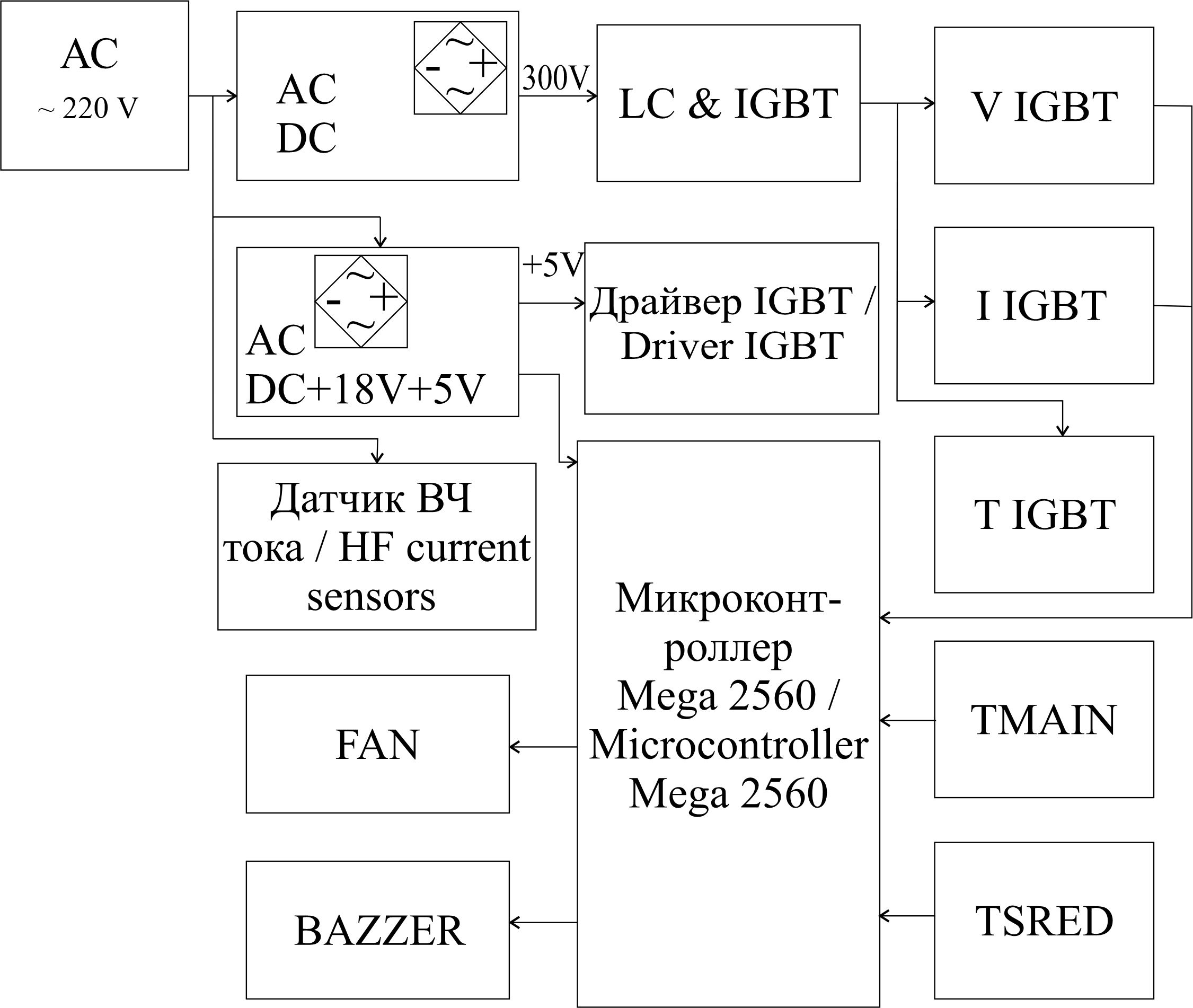 Рис. 2. Функциональная блок-схема силового модуля прототипа пастеризатора с индукционным нагревом