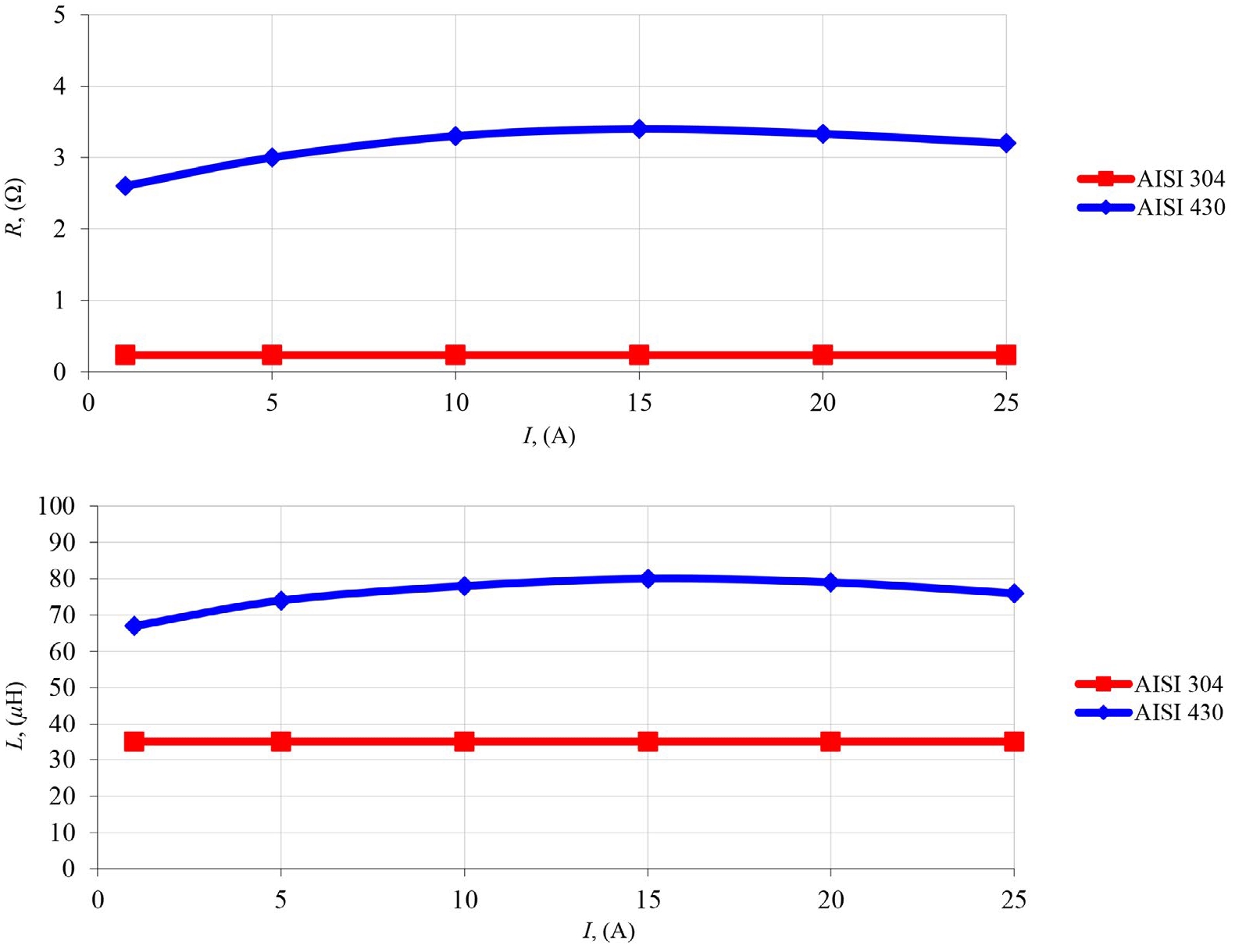 Для обоснования выбора марки стали, необходимой для изготовления емкости и осуществления принципа индукционного нагрева, были проведены испытания генератора с использованием в качестве нагрузки емкости из нержавеющей стали разных марок. На рисунке 3 показаны результаты изменения сопротивлений и индуктивности при изменении силы от 1 до 25 А при фиксированном значении резонансной частоты ƒ = 40 кГц на ферромагнитной (AISI 430) и неферромагнитной (AISI 304) емкостях.