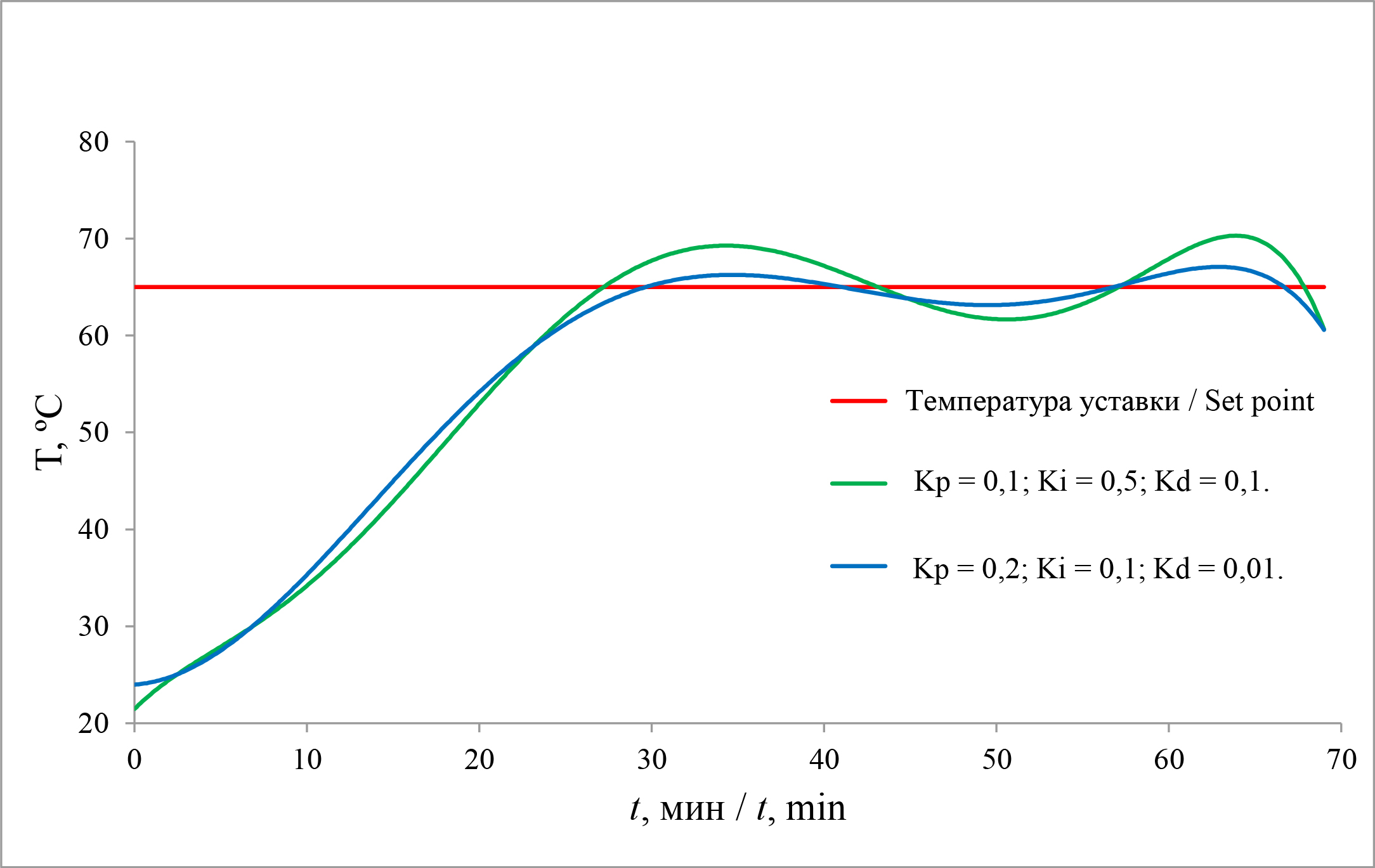 На рисунке 5 указаны 2 различных переходных процесса регулирования температурой относительно задаваемой температуры уставки 65 ºС, необходимой для пастеризации 50 л сырья. Из эксперимента следует, что в течение 30 мин. происходит нагрев сырья до температуры уставки, далее установка переходит в режим выдержки. В первом случае подбора коэффициентов PID-регулирования наблюдается сильное увеличение статистической ошибки за счет неоптимальных коэффициентов, температура после выхода на режим выдерживания (65 °С) относительно уставки на 5–7 °С превышает заданное значение. Во втором случае регулирование происходит плавно, при оптимальных значениях коэффициентов PID-регулирования статистическая ошибка температуры не превышает 3 ºС.