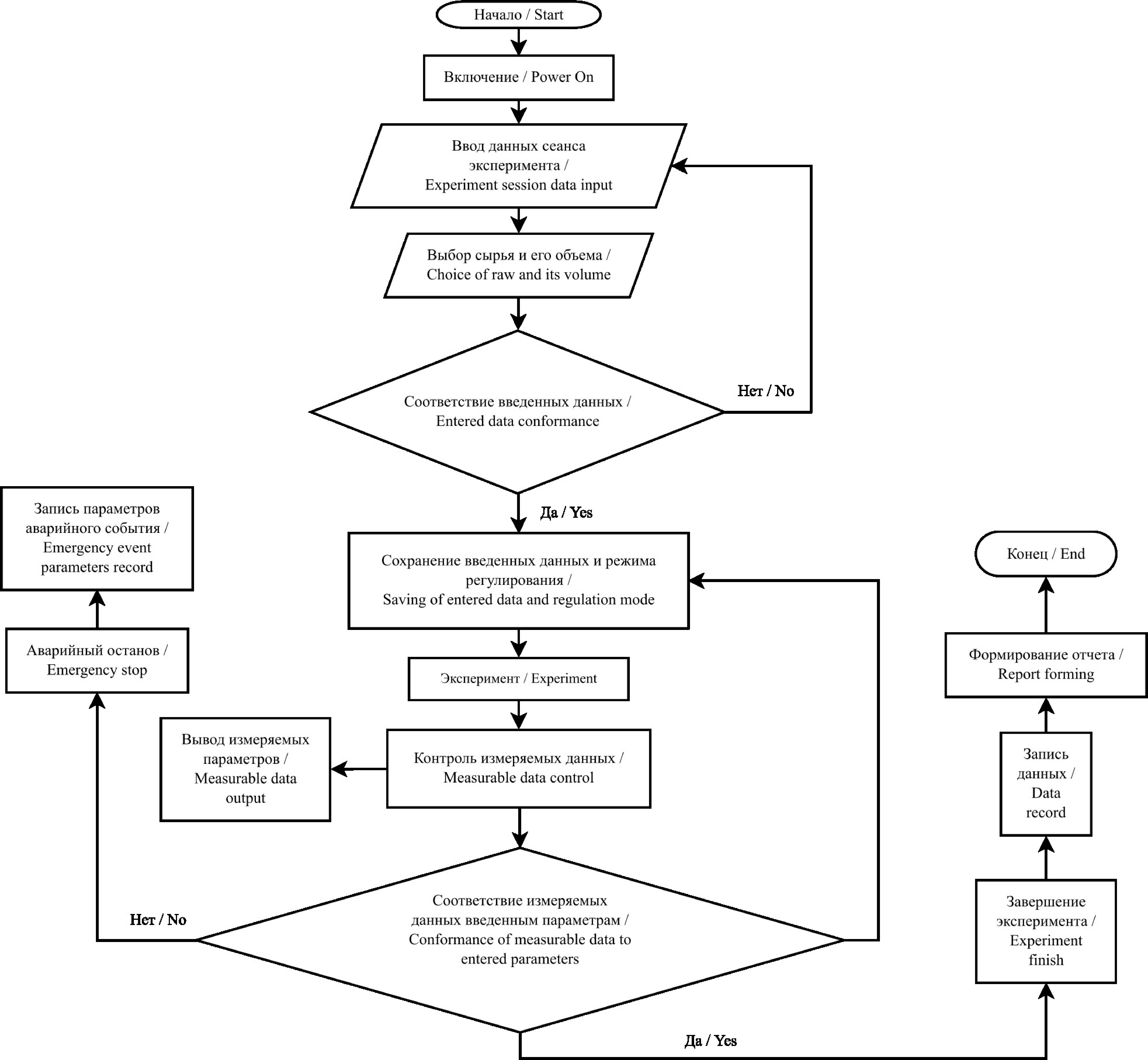 Алгоритм регулирования процессом пастеризации молока в экспериментальной установке представлен на рисунке 6. После включения установки проходит ее инициализация – проверка базовых параметров, несоответствие которых с предусмотренными значениями не позволяет проводить процесс пастеризации. Такими параметрами являются ток и напряжение питания, подаваемые на индуктор, а также скорость перемешивания и температура пастеризации. Если эти параметры не соответствуют предусмотренным значениям, установка перезапускается.