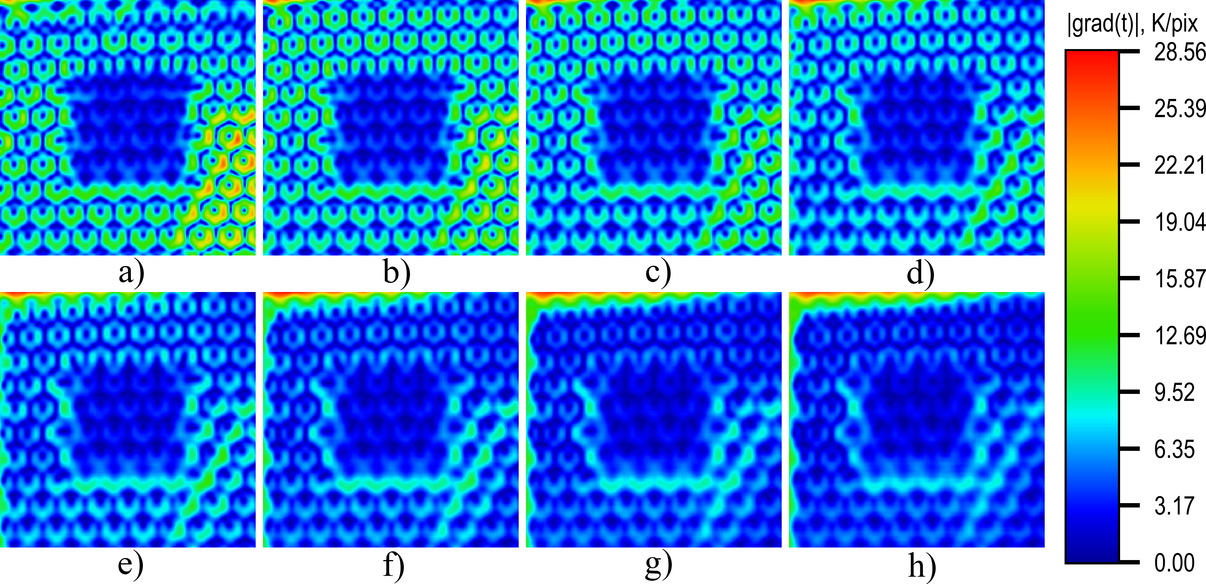F i g. 6. Calculation of the absolute value of the gradient in the defective area and its surroundings at different times after heating: a) 0 s; b) 1 s; c) 2 s; d) 3 s; e) 4 s; f) 5 s; g) 6 s; h) 7 s