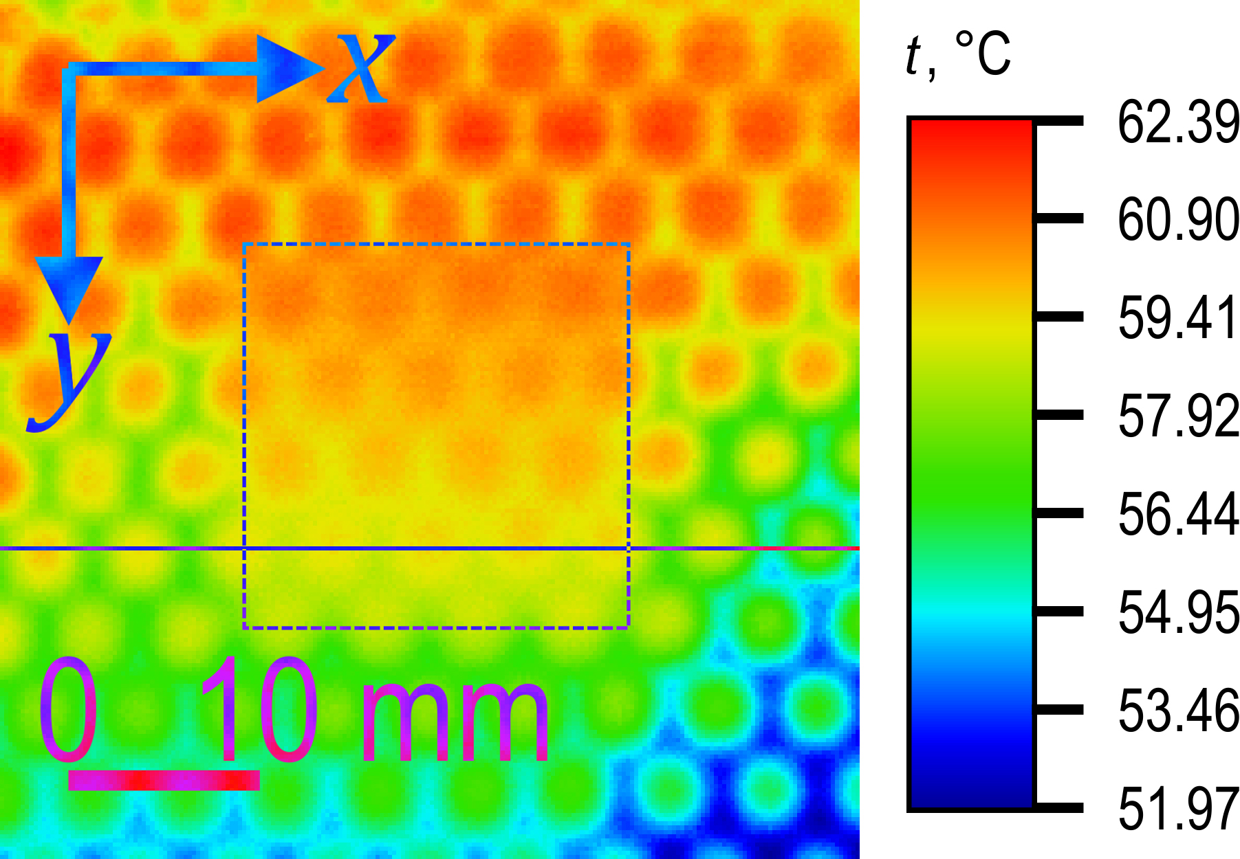 Results. For thermographic methods, the flaw is local heterogeneity of thermal physical characteristics. In the case of a honeycomb material, considering a flaw as inhomogeneity is complicated by the inhomogeneous structure of the material itself. In addition, the honeycombs have slightly different sizes and shapes, and therefore the heat removal from the heated surface layer may be uneven and irregular, and much lower than for a solid material. This is due to the fact that the entire volume of the material participates in heat removal from a solid specimen, whereas in the case of a material with a honeycomb core, heat is removed into the material mainly by thin honeycomb walls made of polymer and having low thermal conductivity. Figure 1 shows a fragment of a thermogram of a defect free region of a honeycomb composite material.