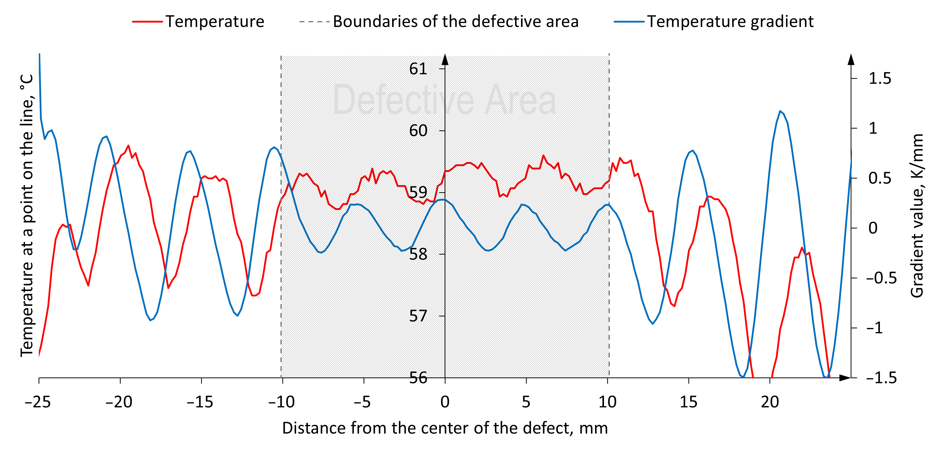 To estimate the change of thermal flow in defect area the simplest informative parameter, calculated as a moving average of the absolute value of the surface temperature gradient can be used.