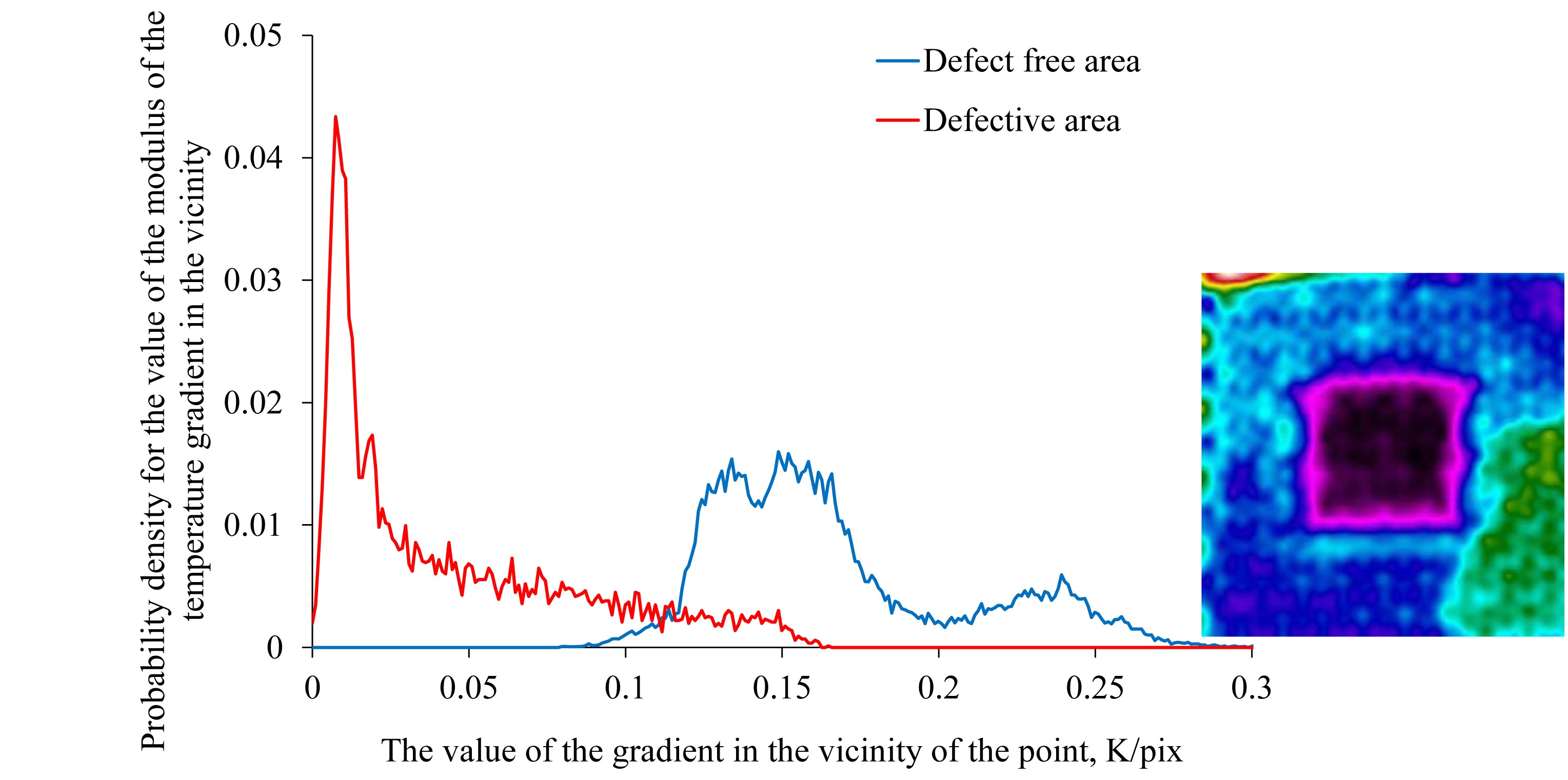 To verify this assumption, there was selected a thermal film frame immediately following after the heater output of the flaw area. Using specialized software, the gradient values in the frame were calculated. The gradient for each point was calculated on a circular area with a radius of 6 pixels. This radius was chosen so that the gradient calculation area corresponded to the size of the area of monotonic temperature change, which made it possible to estimate the temperature gradient created by heat leakage into the nearest wall. Since the gradient was proportional to this leakage, and the amount of leakage depended on the flaw presence, the gradient can be used to determine flaw in the area of a selected point. In this case, gradients along the x and y axes were calculated as the coefficient of linear regression of temperature on the corresponding coordinate. This approach suppresses the noise, since each coefficient results from processing many pixels. Using the linear regression coefficients of temperature from x and y, the gradient magnitude and its direction (i.e., the polar coordinates of the gradient vector) were calculated. Figure 2 shows the obtained results.
