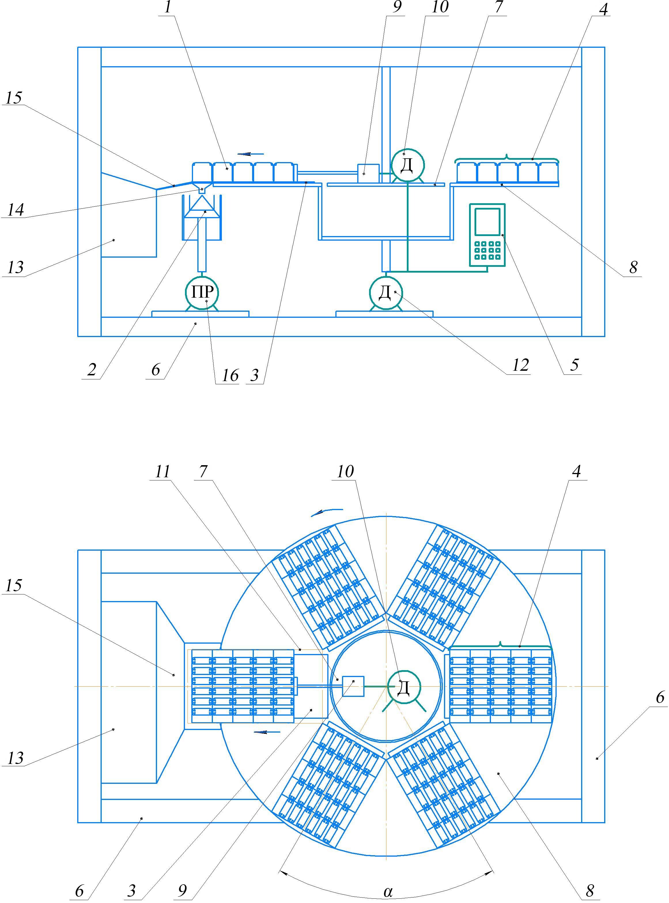 Р и с. 1. Принципиальная схема РКЗУ карусельного типа (вид сбоку и сверху): 1 – кассета с ячейками для высеваемого материала; 2 – высевающий аппарат; 3 – направляющая пластина; 4 – кассетный блок; 5 – блок управления; 6 – рама; 7 – центральная неподвижная платформа; 8 – внешняя подвижная платформа; 9 – актуатор; 10 – электродвигатель привода актуатора; 11 – рабочая зона перемещения кассет; 12 – электродвигатель привода внешней подвижной платформы; 13 – контейнер для сбора пустых кассет; 14 – рабочий стол с выгрузными отверстиями; 15 – наклонный лоток для спуска пустых кассет; 16 – привод высевающего аппарата