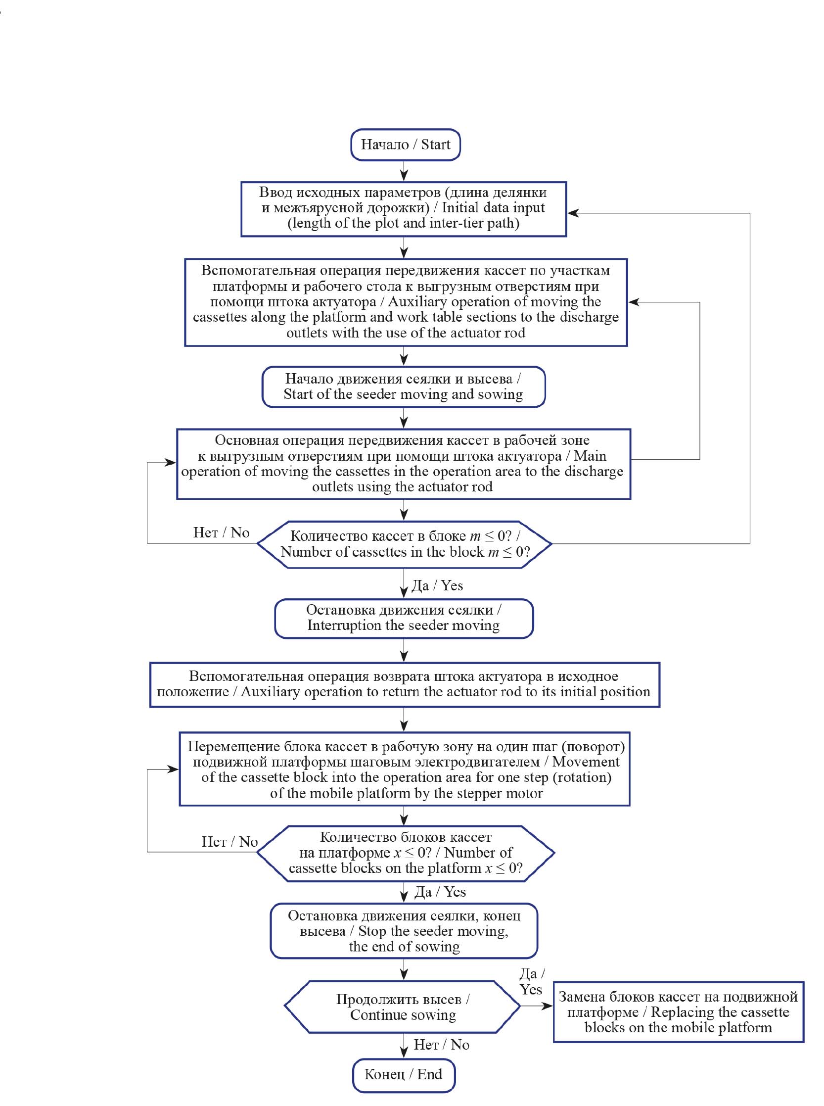 Вторая вспомогательная операция включает в себя возврат штока актуатора в исходное положение перед подачей следующего блока кассет с семенами. При этом шток перемещается на величину: