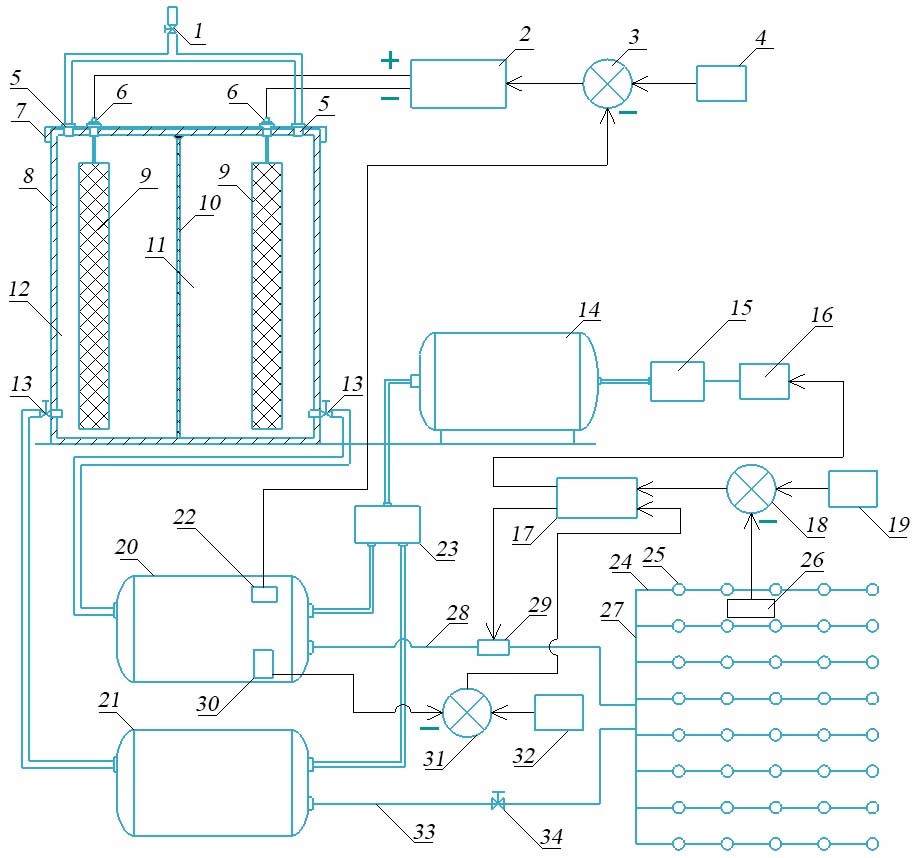 1 – кран подачи воды; 2 – источник регулируемого напряжения; 3 – элемент сравнения водородного показателя pH от датчика и заданного; 4 – блок задания pH; 5 – заливные отверстия; 6 – клеммы подключения источника питания к электродам; 7 – крышка камеры активатора; 8 – камера активатора; 9 – электроды; 10 – полунепроницаемая диафрагма; 11 – катодная камера; 12 – анодная камера; 13 – краны регулировки расхода католита и анолита; 14 – генератор озона; 15 – компрессор; 16 – реле времени; 17 – микроконтроллер; 18 – блок сравнения влажности почвы; 19 – блок задания влажности почвы; 20 – емкость с католитом; 21 – емкость с анолитом; 22 – датчик водородного показателя; 23 – стабилизатор концентрации озона; 24 – система капельного орошения; 25 – форсунка капельного полива; 26 – датчик влажности почвы; 27 – трубопровод для подачи в систему орошения; 28 – магистраль подачи католита; 29 – регулятор расхода католита; 30 – датчик концентрации озона в католите; 31 – устройство сравнения концентрации озона в католите с заданной; 32 – блок задания концентрации озона; 33 – магистраль подачи анолита; 34 – регулировка подачи анолита в систему орошения