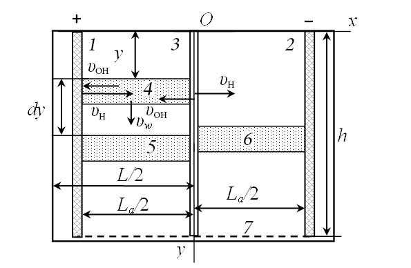 Для определения изменения концентрации ионов водорода в анодной камере воспользуемся следующими обозначениями : Oxy – прямоугольная система декартовых координат с началом на верхнем уровне воды между анодной и катодной камерами, осью Ox, направленной перпендикулярно плоскости электрода от анода к катоду, и осью Oy, направленной вниз; L – расстояние между фронтальными стенками камеры электроактиватора, м; La – расстояние между электродами, м; h – высота катодной и анодной камер, м; S – площадь рабочей поверхности катода или анода, м2; υw – скорость частицы воды в камерах анода и катода, м/с; υH, υOH – скорость соответственно гидратированных иона водорода и гидроксид иона, м/с; uH, uOH – подвижность соответственно гидратированных иона водорода и гидроксид иона, м2/(В·с); CH, COH – молярная концентрация соответственно иона водорода и гидроксид-иона, кмоль/м3; CHk, COHk – молярная концентрация соответственно иона водорода и гидроксид-иона в католите катодной камеры, кмоль /м3; CHa – молярная концентрация иона водорода в анолите анодной камеры, кмоль м3; N – число Авогадро N = 6,022·1023 1/моль; kw – ионное произведение воды, (кмоль/м3)2 (kw = 10 ̶ 14 при температуре 22 оС); pH – водородный показатель воды; pH0 – водородный показатель воды перед электроактивацией; pHk, pHa – водородный показатель соответственно католита и анолита; U – ЭДС источника питания, В; η – КПД источника питания; I – величина тока между электродами, А; Rk, Ra, Rd – сопротивление соответственно католита в катодной камере, анолита в анодной камере и диафрагмы между камерами, Ом; Ea, Ek – средняя напряженность электрического поля соответственно в анодной камере и катодной камере, В/м; Q – производительность анодной или катодной камеры при подготовке анолита или католита, м3/с; ΔTk, ΔTa – повышение температуры соответственно католита и анолита, оС; cp – теплоемкость католита и анолита, Дж/(кг оK); ρw – удельное сопротивление воды при данной температуре, ом·м; α – пористость диафрагмы; l – толщина диафрагмы, м; ρ – плотность воды, кг/м3.