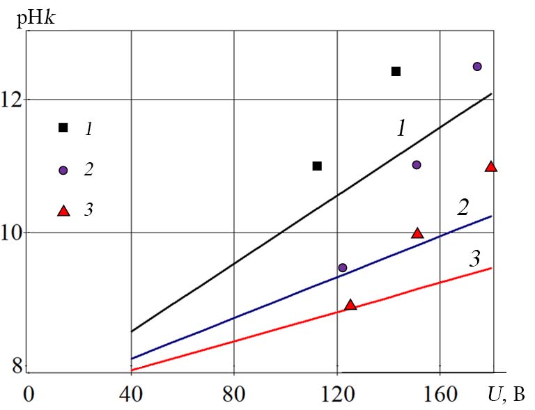 Fig. 4. Graph of the dependence of the pH index of the catholyte on the potential difference U between the electrodes at the productivity of the cathode chamber, indicating the experimental points: 1 – 15 l/h; 2 – 25 l/h; 3 – 35 l/h