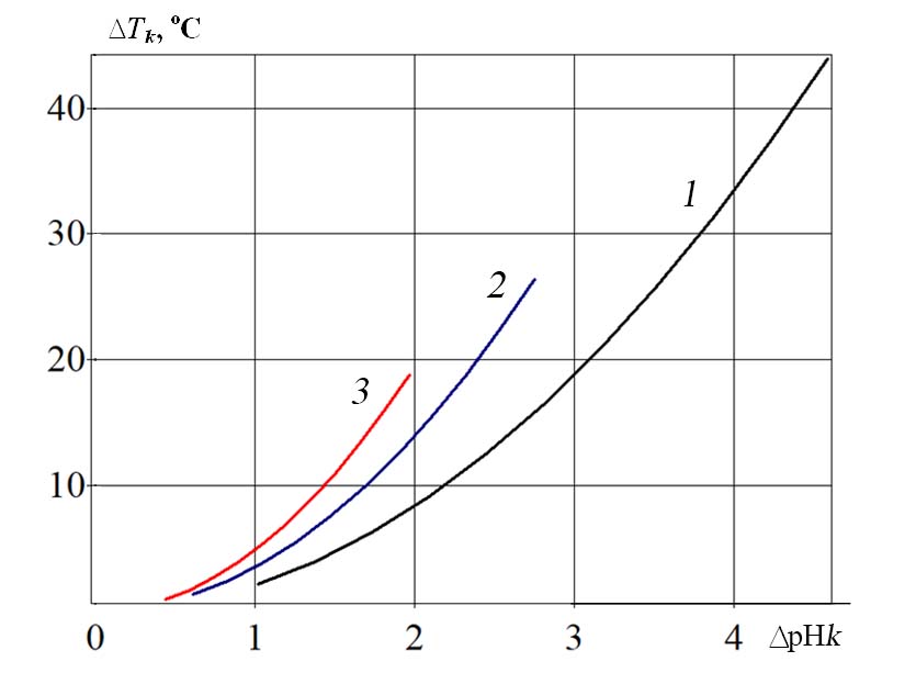 Fig. 5. Relationship between an increase in the ∆Tk temperature of the catholyte and a change in the pH index of the catholyte ∆pHk at a cathode chamber productivity: